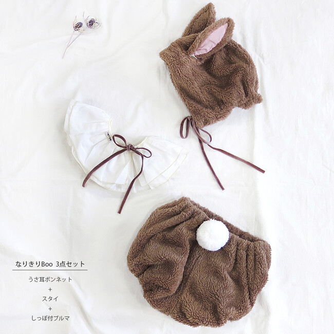 うさ耳ボンネット・つけ襟スタイ・しっぽ付きブルマの3点セットで、着替えの手間もなくあっという間にうさぎに変身できると好評です!