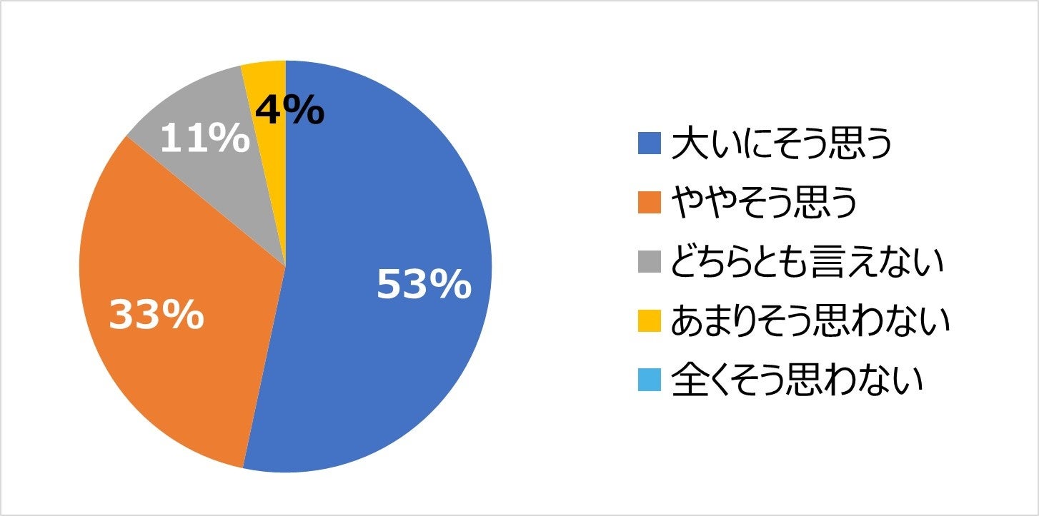 まず、自社において「社員間のコミュニケーション不足は業務の障害になると思うか」について確認してみたところ、53%が「大いにそう思う」として圧倒的に多く、次いで「ややそう思う」が33%で、これらを合計した「そう思う」とする割合は86%となり、9割近くの企業において「社員間のコミュニケーション不足は業務の障害になる」と捉えていることがわかる。