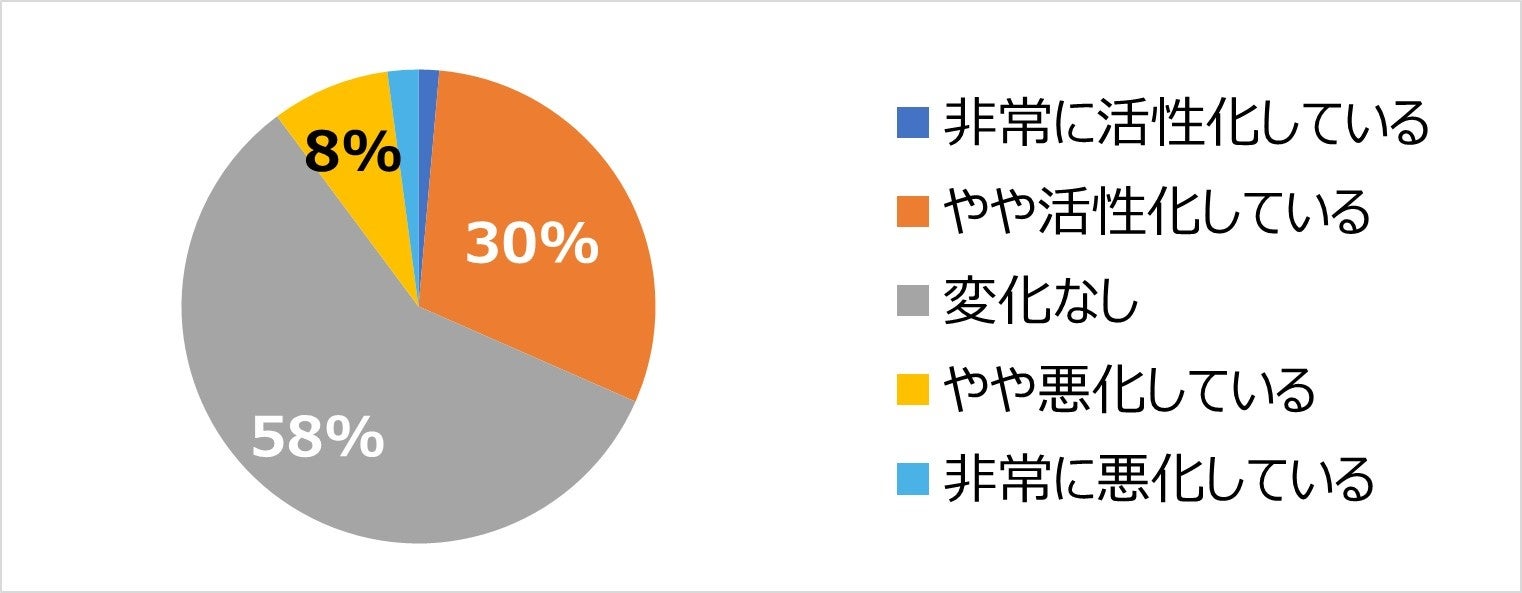 「変化なし」が圧倒的に多く58%と6割近くで、次いで「やや活性化している」が30%となっている。「活性化している」(「非常に活性化している」と「やや活性化している」の合計、以下同じ)の割合は32%と3割で、一方、「悪化している」(「やや悪化している」と「非常に悪化している」の合計、以下同じ)は10%と1割にとどまっている。「変化なし」が多数派ではあるものの、活性化と悪化の割合を比較すると「活性化している」企業の方が多い傾向となっている。