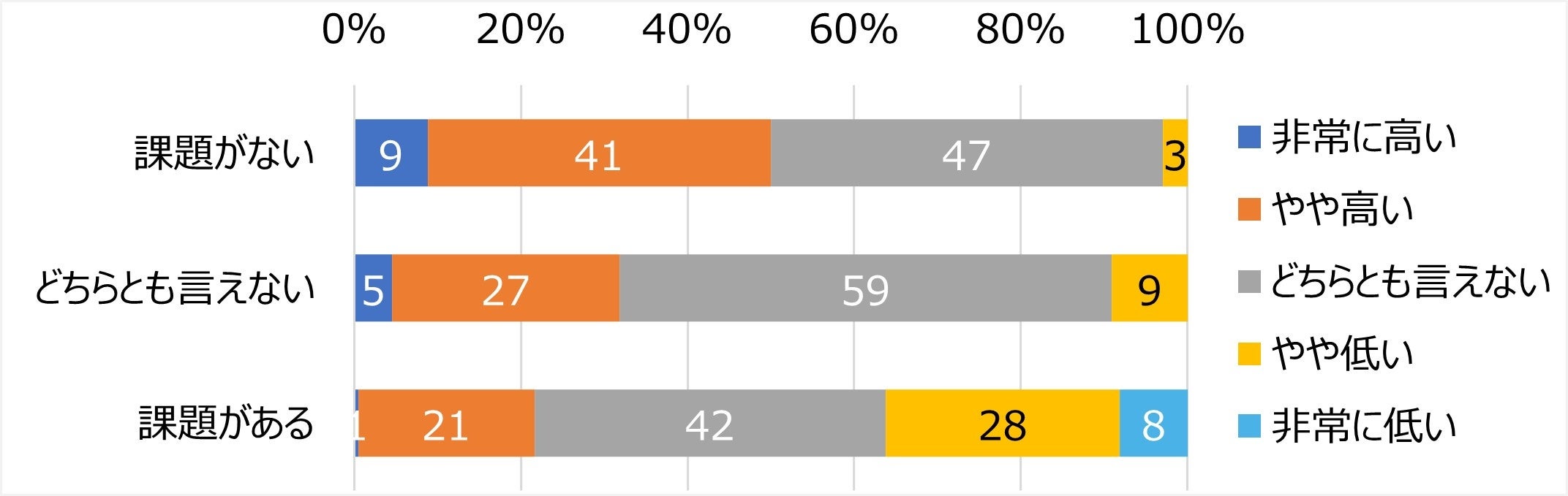 社内コミュニケーションの課題感別に従業員エンゲージメントの状態を見ると、社内コミュニケーションに「課題がない」企業群では従業員エンゲージメントが「非常に高い」(9%)と「やや高い」(41%)を合計した「高い」の割合が50%と半数に上る。同様に、社内コミュニケーションの課題感が「どちらとも言えない」企業群では32%、「課題感がある」企業群では22%と2割にとどまり、逆に「非常に低い」と「やや低い」を合計した「低い」の割合が36%と、「高い」を大きく上回っている。社内コミュニケーションに課題感がない企業ほど従業員エンゲージメントが顕著に高い傾向が見られている。