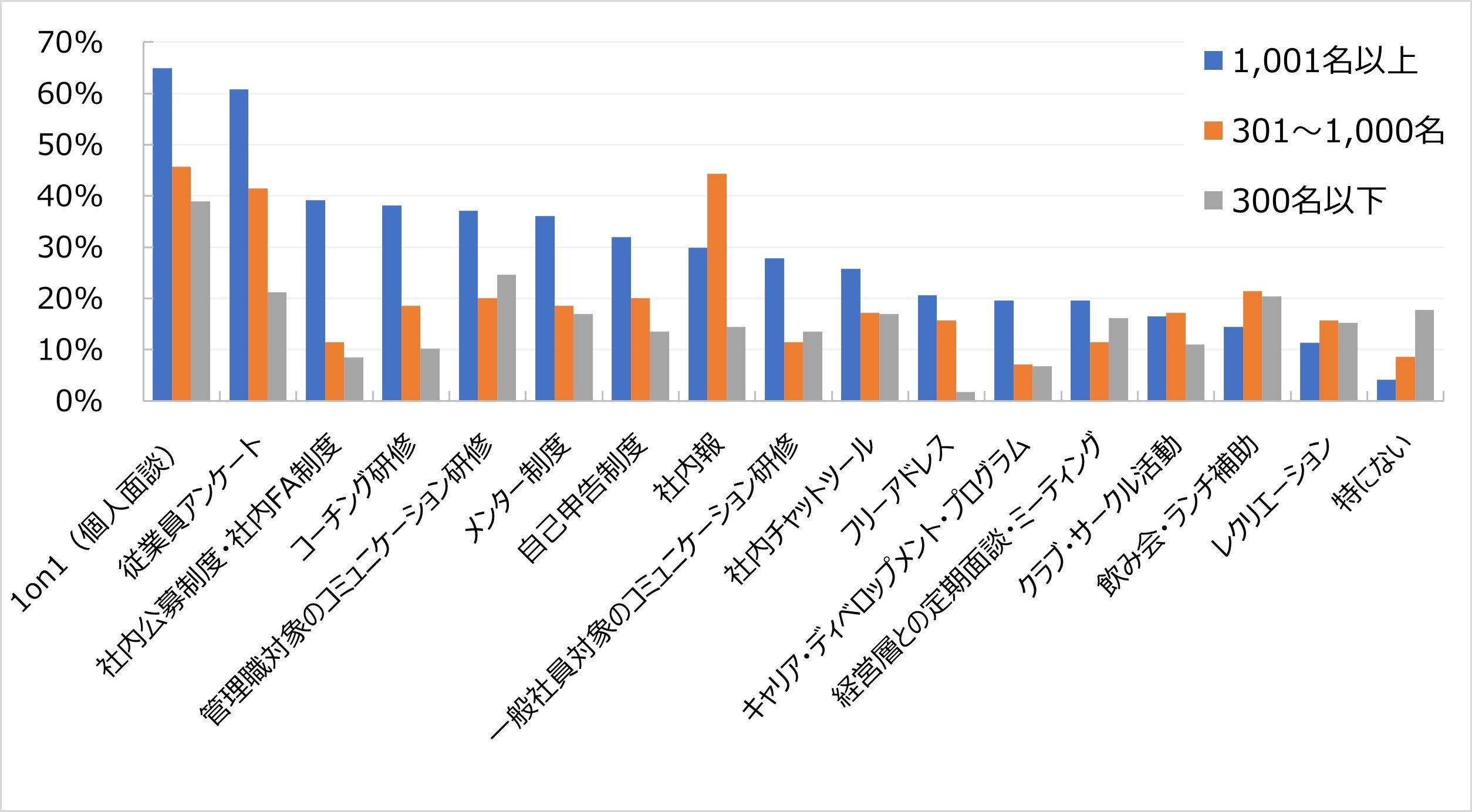・同好会制度により業務外コミュニケーションの支援を強化したこと、一部マネージャーがコミュニケーション課題に対し具体的なアクションを起こし、それが成果につながり始めていること(300名以下・サービス)