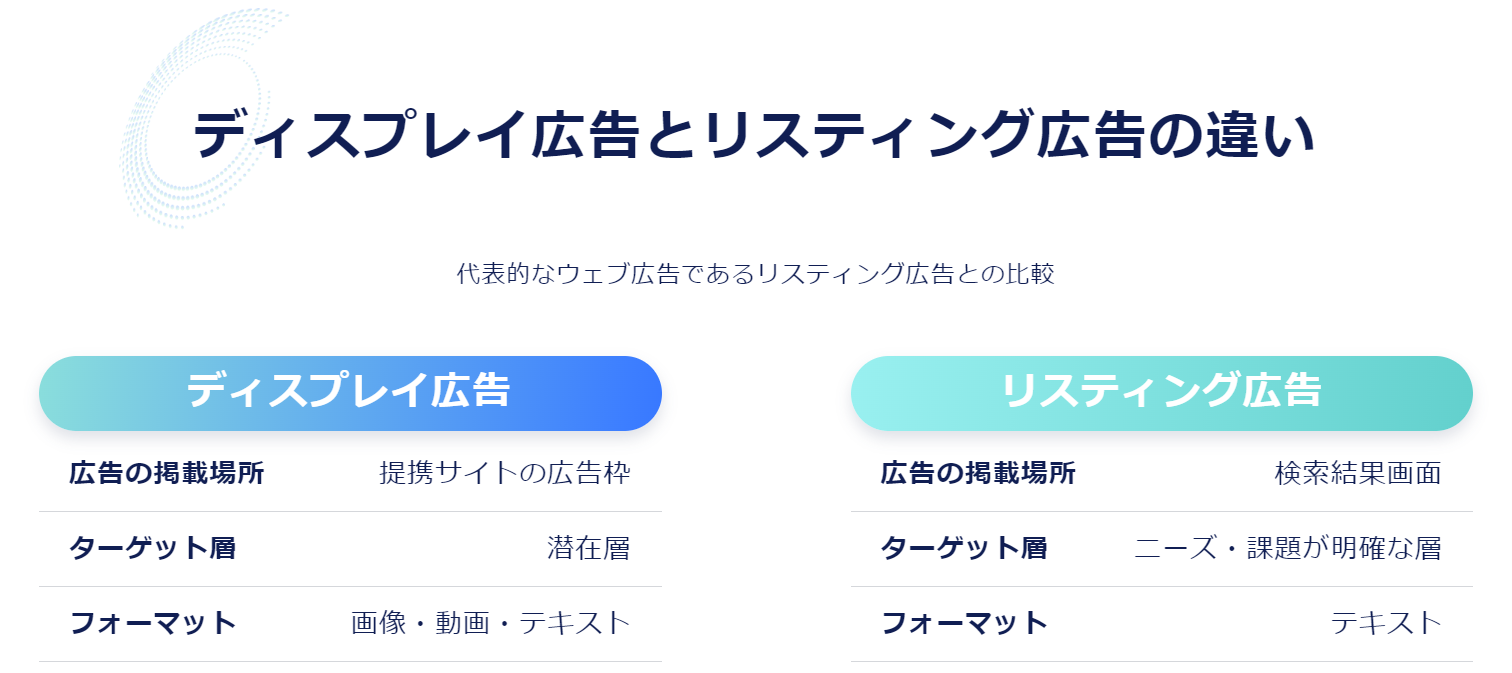 代表的なWeb広告である「リスティング広告」は検索キーワードをもとに顕在層へのアプローチを行うのに対して、「ディスプレイ広告」はまだ自身のニーズに気づいていない潜在層にアプローチできるのが特徴です。