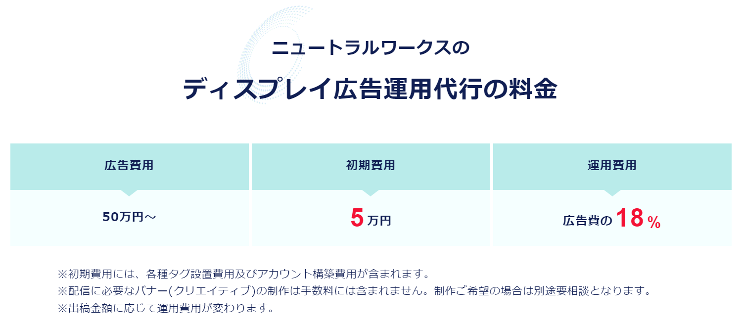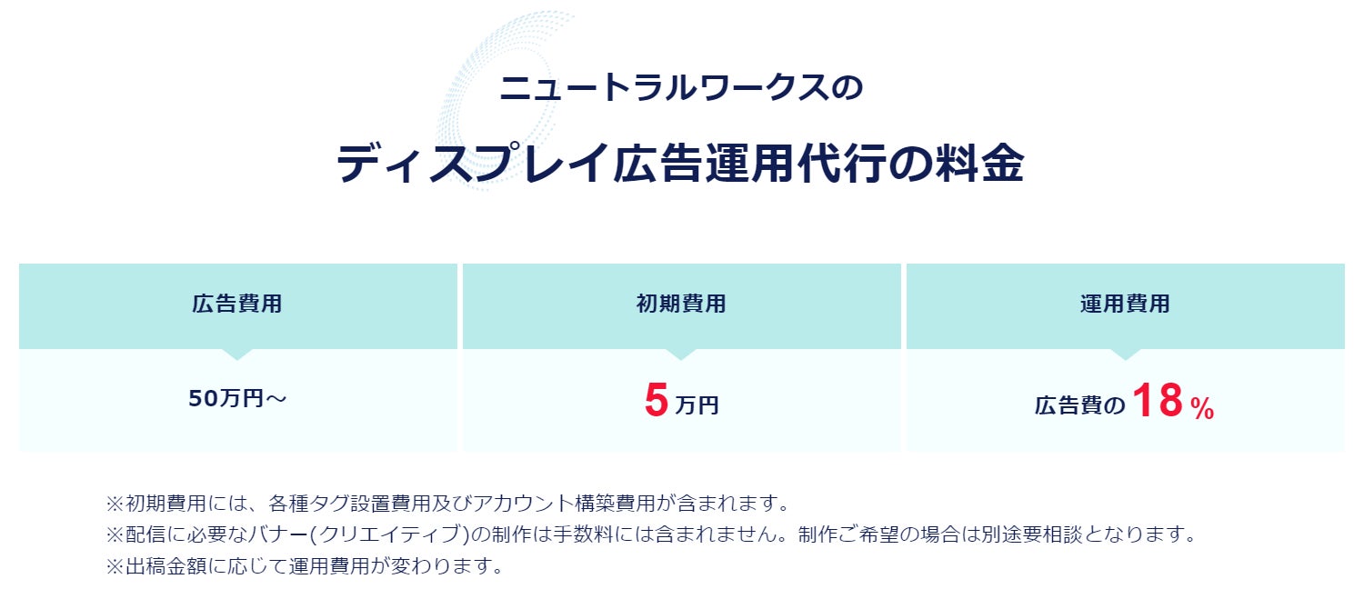 ニュートラルワークスのディスプレイ広告運用代行はリーズナブルな価格で提供しており、少額予算でも運用可能です。ご希望の予算額で最適な広告運用プランをご提案いたします。