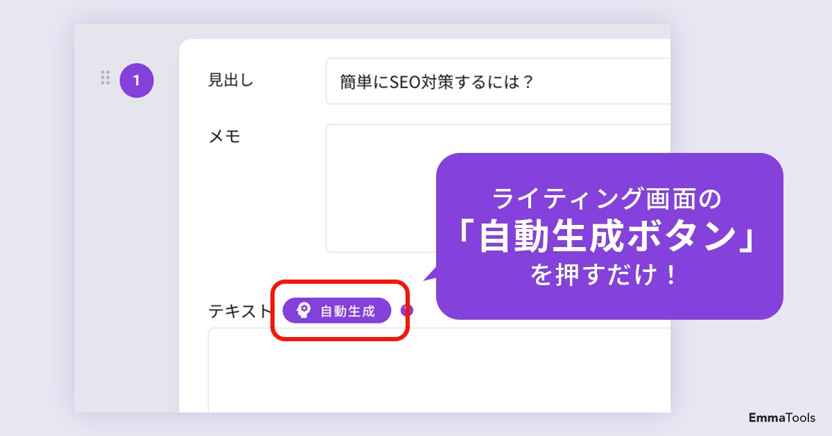 ※ご注意:EmmaToolsでは自動生成されたコンテンツを原文のまま使用することは推奨しておりません。必ず推敲するようにお願いいたします。(自動生成のボタンを押した際にも本アラートが出るようになっております。)