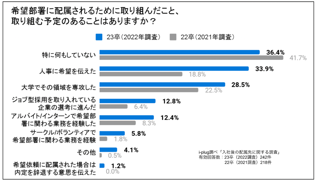学生と企業をつなげる新卒ダイレクトリクルーティングサービス「OfferBox(オファーボックス)」を運営する株式会社i-plug(本社:大阪市淀川区、代表取締役CEO:中野智哉)は、2023年卒業予定学生(以下、「23卒学生」)を対象に配属先の希望に関するアンケートを実施しました。
