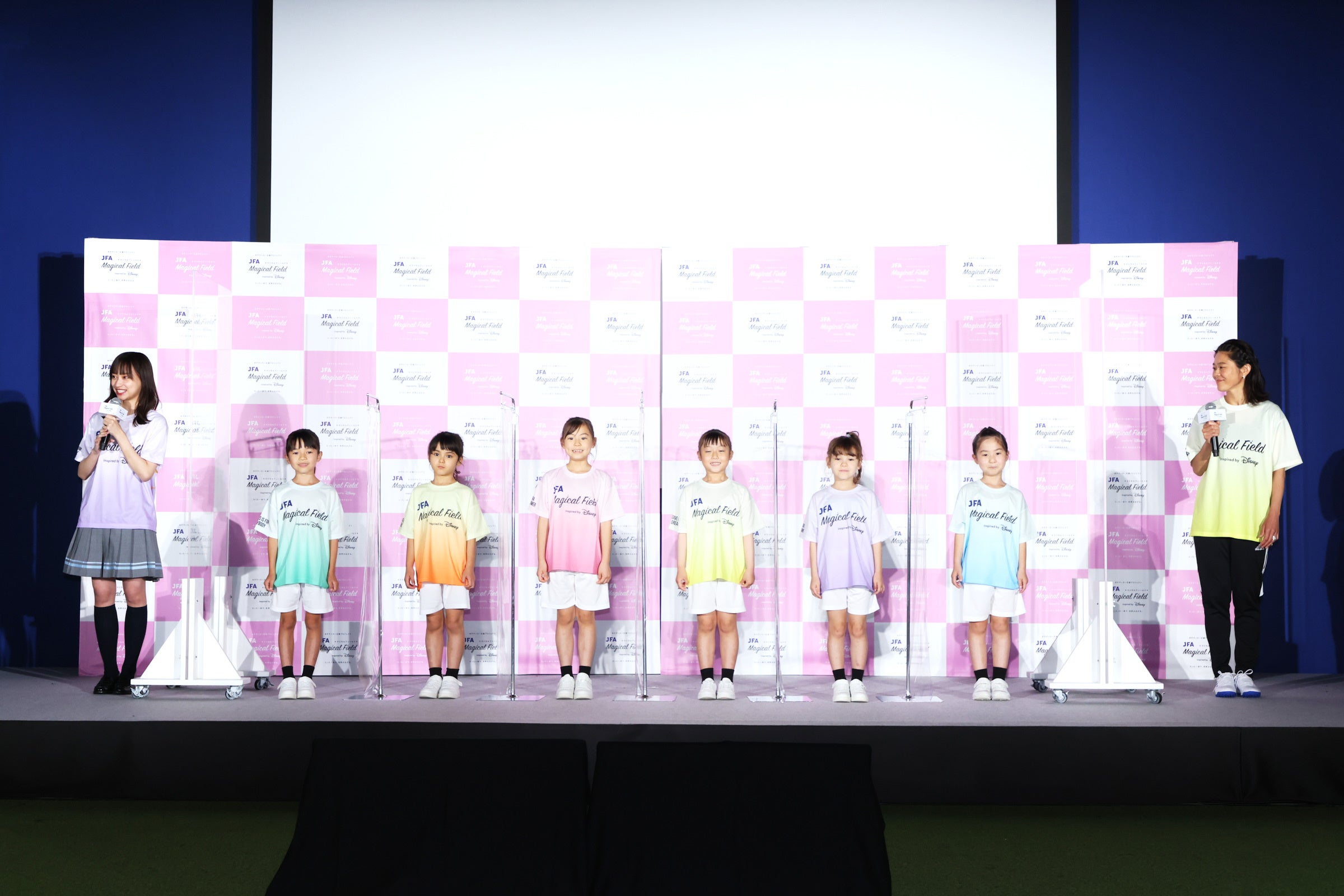 続いて、今回のプロジェクトのためだけにデザインされたオリジナルユニフォームを着用した子どもたちが澤さんの呼びかけで登場しました。子どもたちが後ろを振り向くと、バックブリントにはそれぞれ異なるディズニープリンセスのデザインが。「本当に色とりどりで可愛いです!皆さんがキラキラしていて、このユニフォームを着れば、皆がディズニープリンセスになれると思いました」と笑顔の影山さんと澤さん、会場も和やかな雰囲気でした。