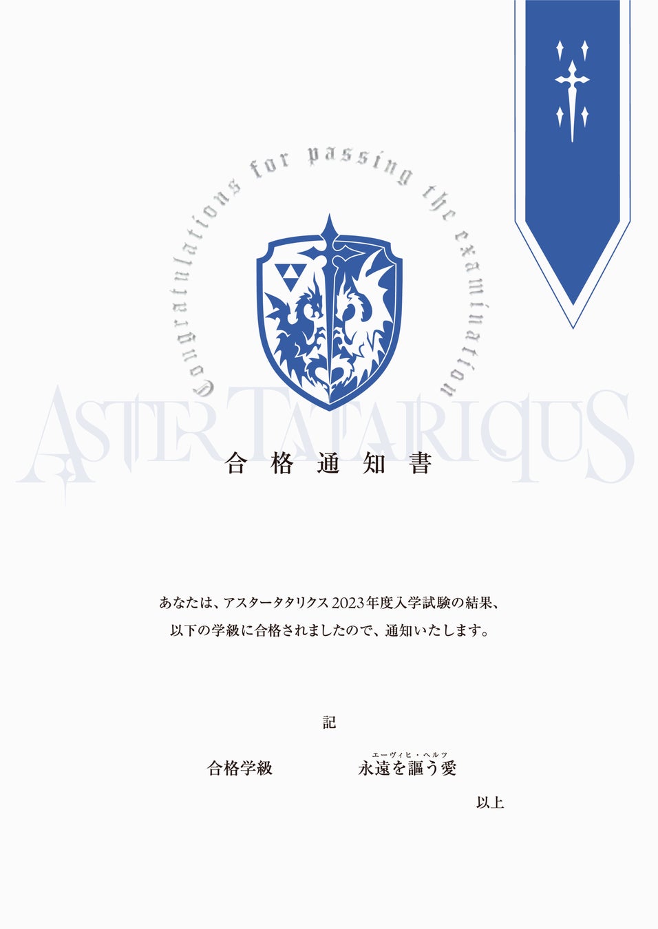 を同梱した「アスタタ合格通知書セット」をプレゼントします。本作の舞台となるキャメロット騎士学術院をモチーフとした本特典の詳細は下記となります。