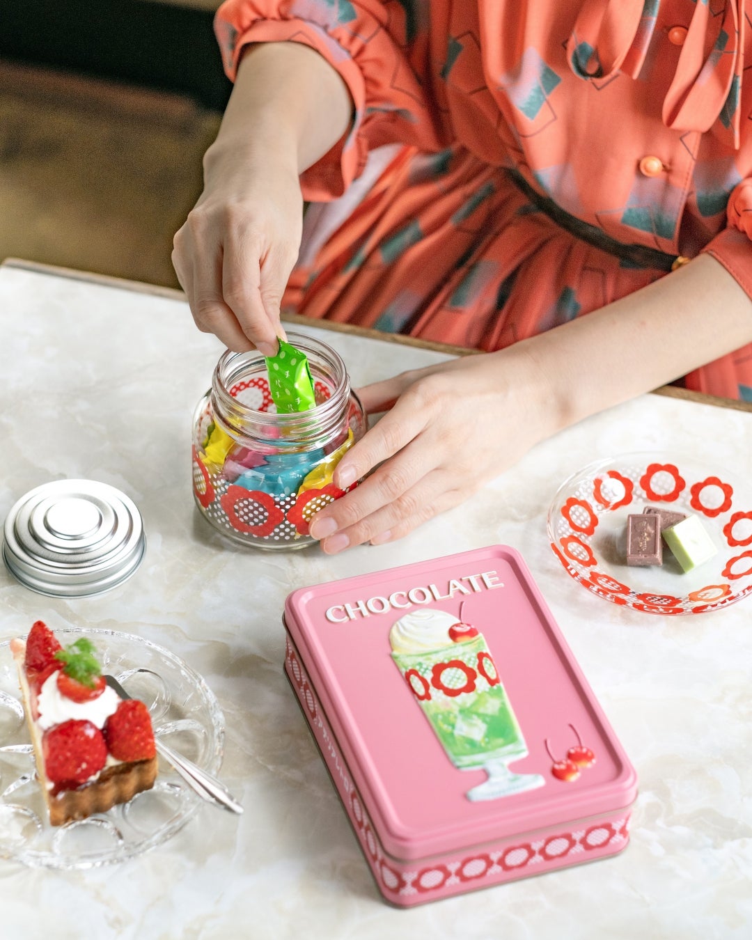 新柄「花だん」の発売は、チョコレートを主力とする洋菓子メーカー 株式会社メリーチョコレートカムパニー(本社:東京都大田区、社長:小屋松 儀晃 以下、メリー)のバレンタイン限定ブランド「はじけるキャンディチョコレート。」のお声がけから始まりました。レトロ喫茶をコンセプトにしたかわいいパッケージと、パチパチ弾ける食感が楽しいメリーの人気商品「はじけるキャンディチョコレート。」とアデリアレトロのグラスウェアを一緒に撮影したSNS投稿をよく見かけることから、親和性が高いと感じコラボレーションすることになりました。