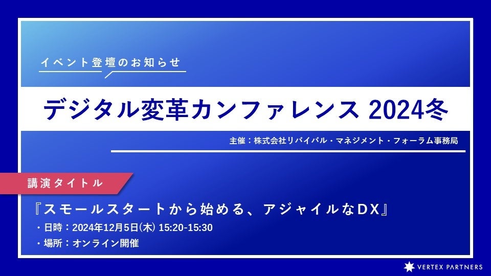 株式会社ベルテクス・パートナーズ(東京都港区、代表取締役:山口正智)は、2024年12月5日(木)にオンライン開催される「デジタル変革カンファレンス2024冬(主催:リバイバル・マネジメント・フォーラム事務局)」へ登壇します。