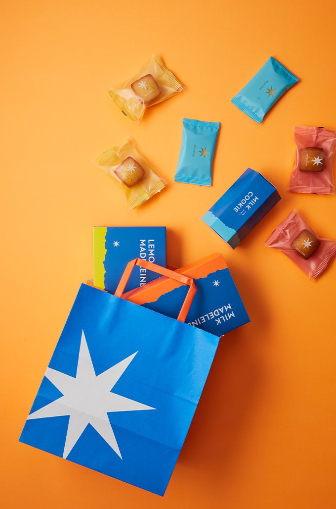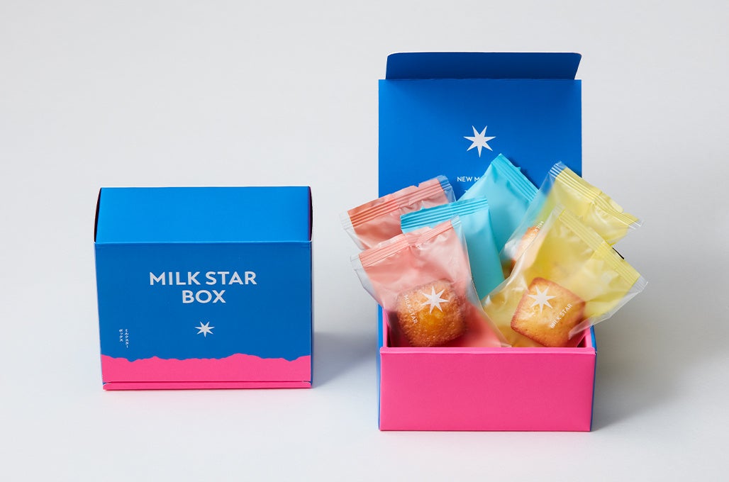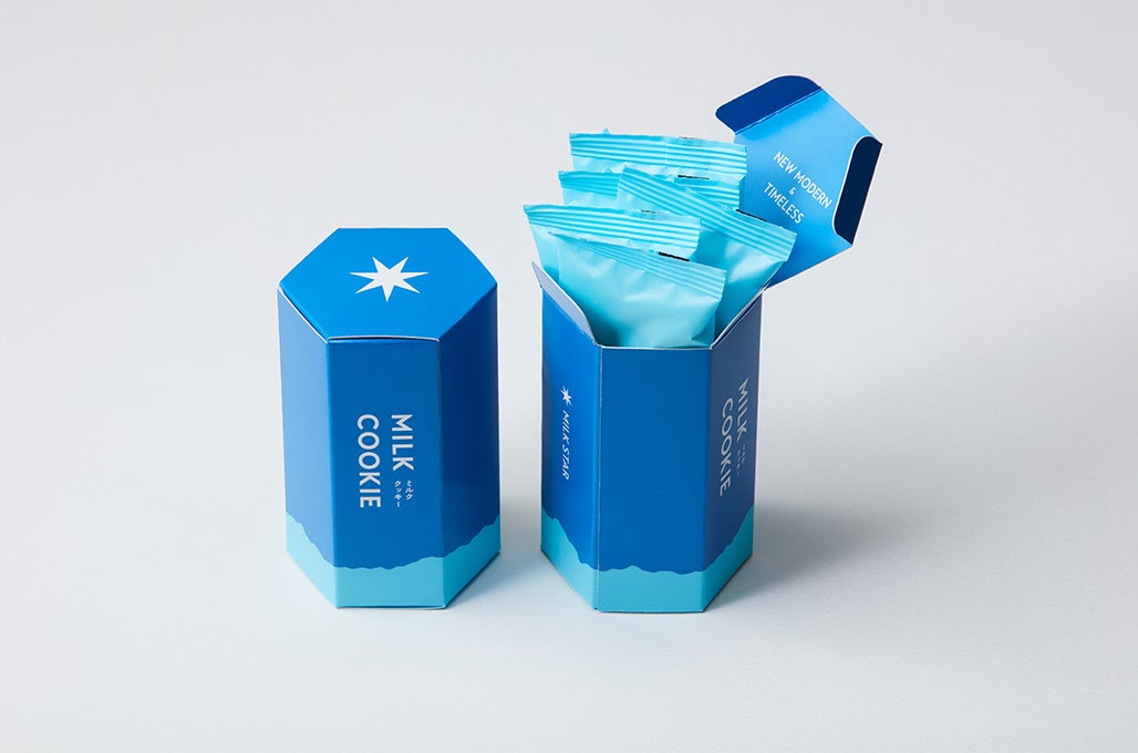 「MILK STAR」はお菓子の味だけでなく、見て・ギフトでもらって楽しんでいただけるようパッケージにはブランドを考えるうえでインスピレーションを受けた北欧の空や海を連想させるブルーをブランドカラーにデザインしました。パッケージからもモダンさ、上品さを感じられる商品は友人や大切な方への贈り物にぜひご利用ください。