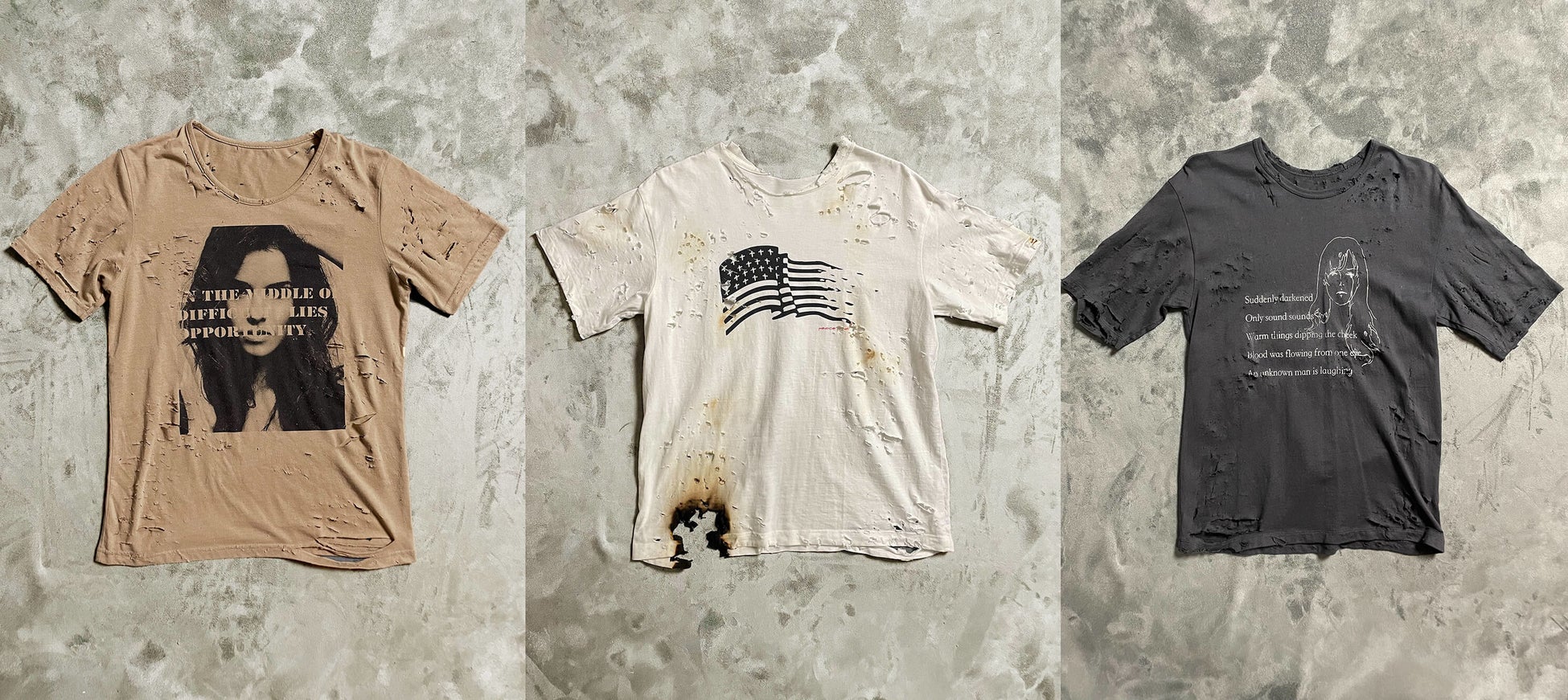 跡部氏自らがダメージ加工を手がけた USED Tシャツも展開いたします。