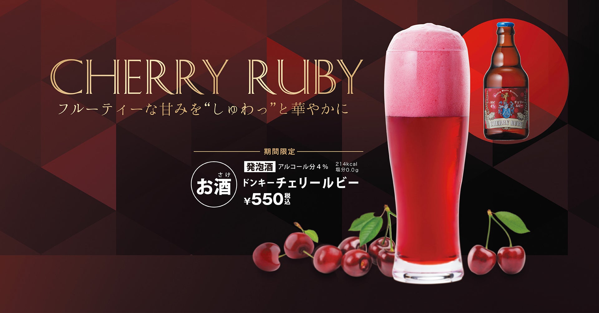 びっくりドンキーでは、定期的に季節限定ビールを販売しており、今回はドンキーチェリールビーが登場します。⿊さくらんぼのフルーティーな⽢みとしゅわっとした喉越しを楽しめるお酒になります。ビール好きにはもちろん、フルーツビール*がお好きな⽅に、特におすすめなメニューです。