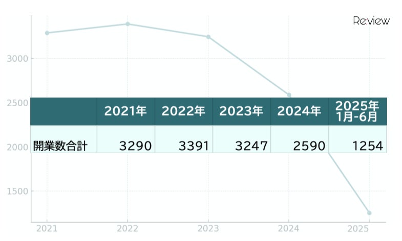 2021年3,290件 → 2022年3,391件 → 2023年3,247件 → 2024年2,590件と推移し、2025年は上半期で1,254件、通年では約2,500件前後の着地見込みです。