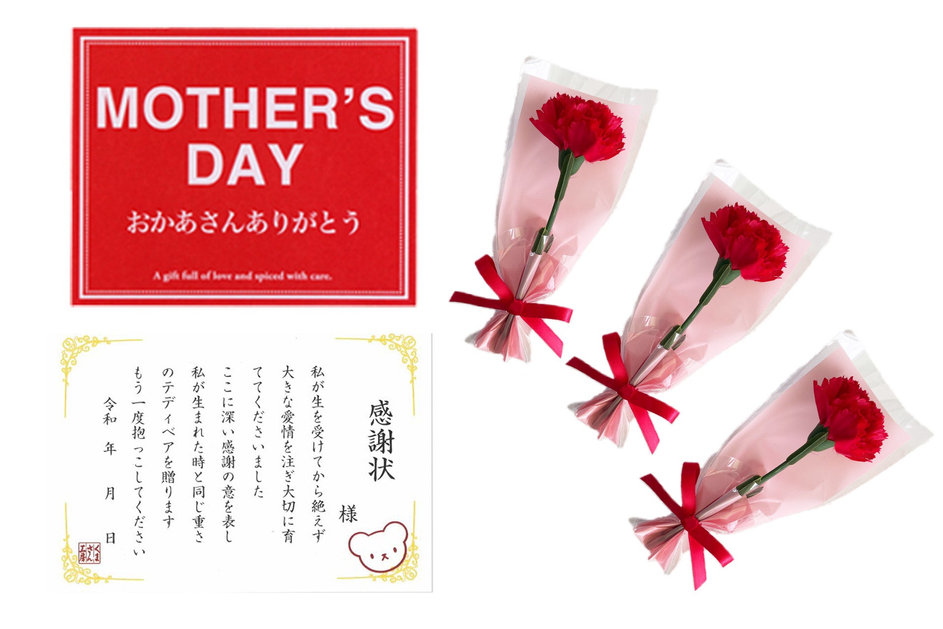 母の日にふさわしい、華やかなカーネーション(造花)と各種メッセージカードをご用意しました。