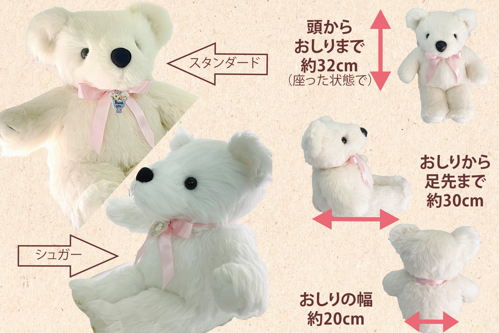 アイボリーがやさしい「スタンダード」、真っ白が映える「シュガー」の2種類を、お母さんに贈る体重ベアとしてご用意しました。くまさん工房が、あなたの大切なお母さまへ自信をもっておすすめできるテディベアです。