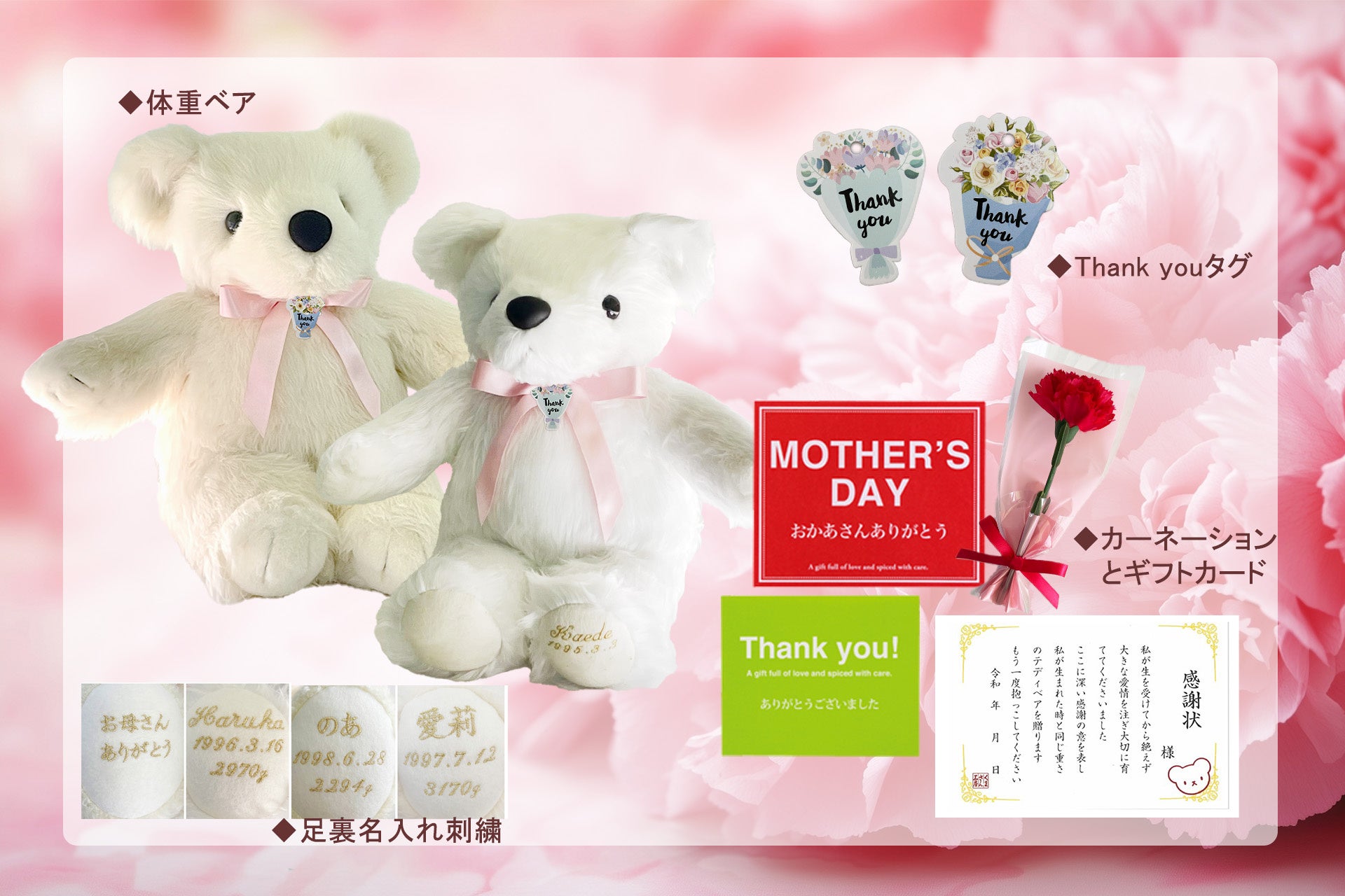 あなたが生まれた時の重さは、世界にひとつしかない“家族の宝物”。ぜひ「体重ベア」に日々の感謝の気持ち「ありがとう」を託して、特別な2025年の母の日を演出しましょう。