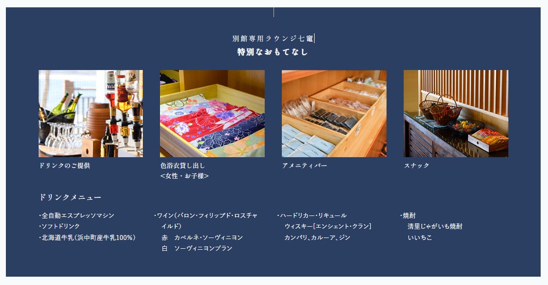 「別館 雅-MIYABI-」にご宿泊のお客様のために、くつろぎの空間とサービスをご提供する専用ラウンジ「七竈(ななかまど)」をご用意しております。アーリーチェックインやレイトチェックアウトをはじめ、お飲み物やお菓子、お夜食にサービスに加え、女性のお客様・お子様には色浴衣のサービスもご提供しています。寛ぎの空間で鶴雅ならではの上質なおもてなしをお楽しみください。