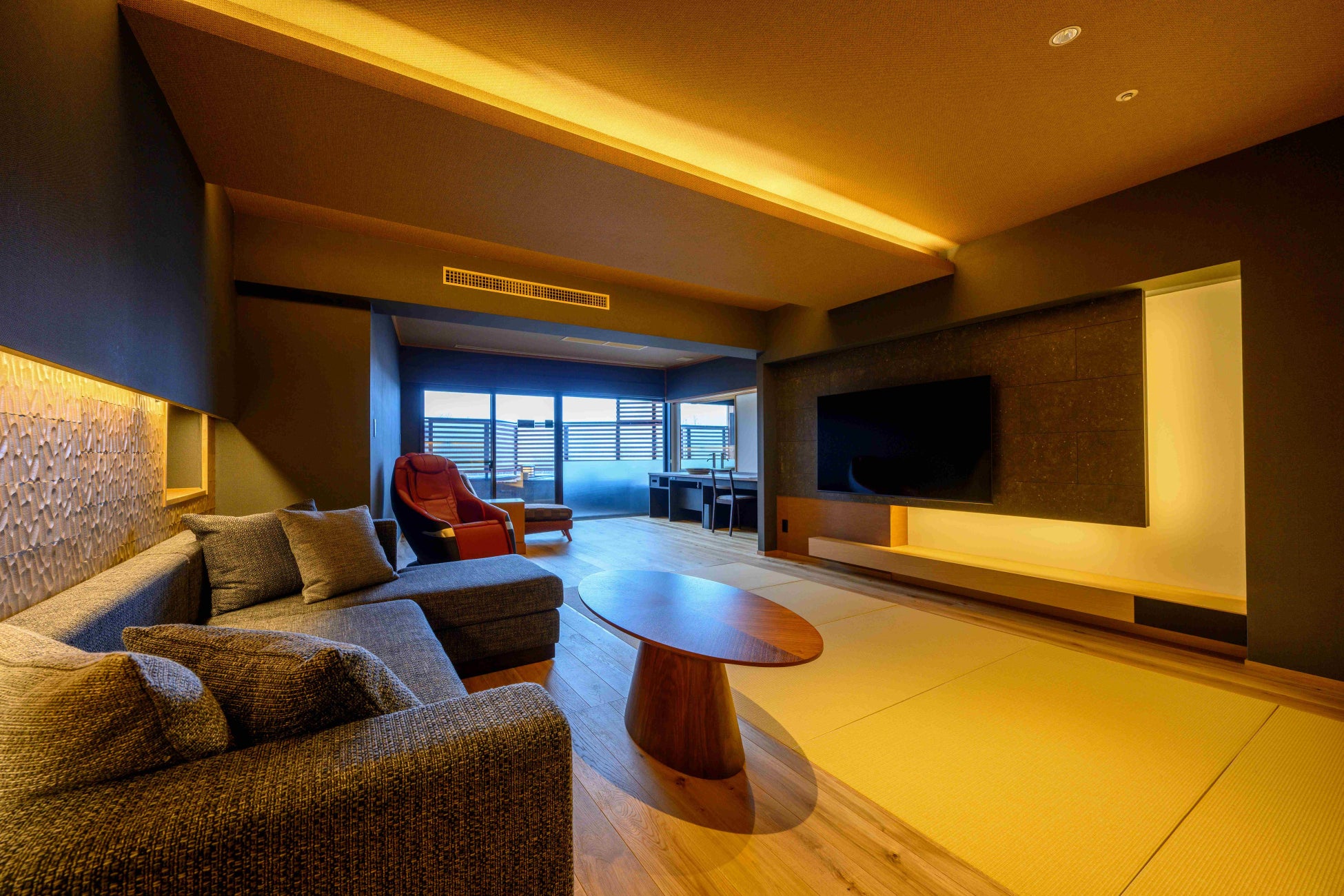 「別館・雅-MIYABI-」の露天風呂付和洋室は、広々とした70平米の空間で定員4名様までご利用いただけます。森の静かな眺望を楽しみながら、温泉のゆるやかな湯音に包まれ、心身ともにリラックスできます。ベッド2台に加え、3名様以上のご利用には布団もご用意しております。広々とした空間でゆったりとした時間をお過ごしいただける客室に生まれ変わりました。