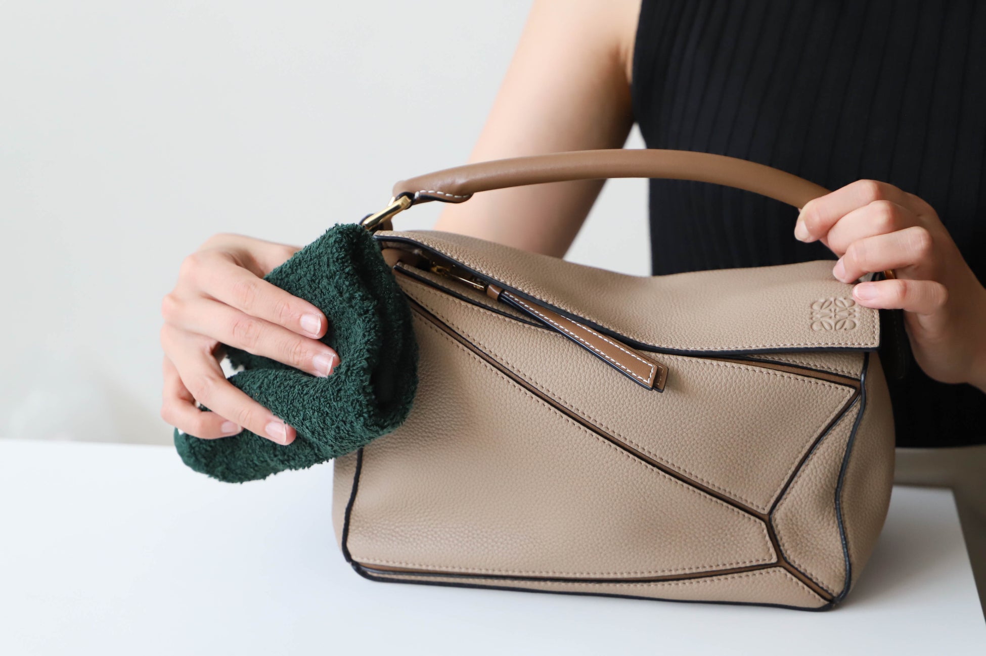 (日焼け止めが付着した場合)乾いたタオルやティッシュなどでしっかり油分を取り除いたあとは、自分で対処するのは難しいため、プロにお願いしましょう。バッグへのダメージが広がるため、アルコールシート等の薬品の使用はお控えください。