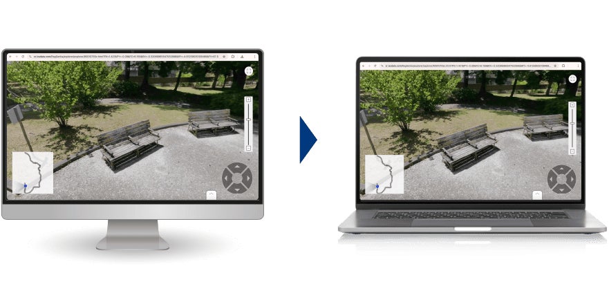 360°ビューの中に表示される経路点を選択して360°画像内を撮影経路に沿って移動できるほか、経路マップウィンドウの中から移動先を選択して移動でき、撮影された現場を空間的に体験することができます。また、URLリンク機能により360°ビュー内の注目点をインターネットを介して伝達することができます。