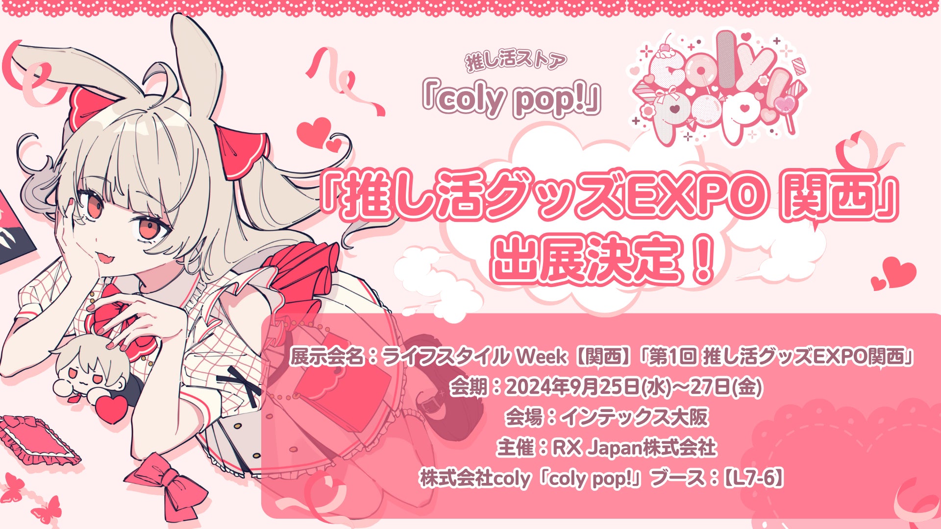 株式会社colyが運営する、だいすきをひろげる、"推し活"ストア「coly pop!」は、2024年9月25日(水)〜27日(金)にインテックス大阪にて開催される「第1回 推し活グッズEXPO関西(主催:RX Japan株式会社)」へ出展いたします。