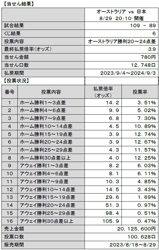 ・第3戦(vs オーストラリア)は、20~24点差でオーストラリア勝利となり、払戻倍率(オッズ)は3.9倍(投票率12.67%)、当せん金額は780円となりました。全16選択肢のうち最も多かった投票内容は、15~19点差でオーストラリア勝利、払戻倍率(オッズ)は3.9倍(投票率12.74%)となった中、2番目に投票の多かった結果となりました。