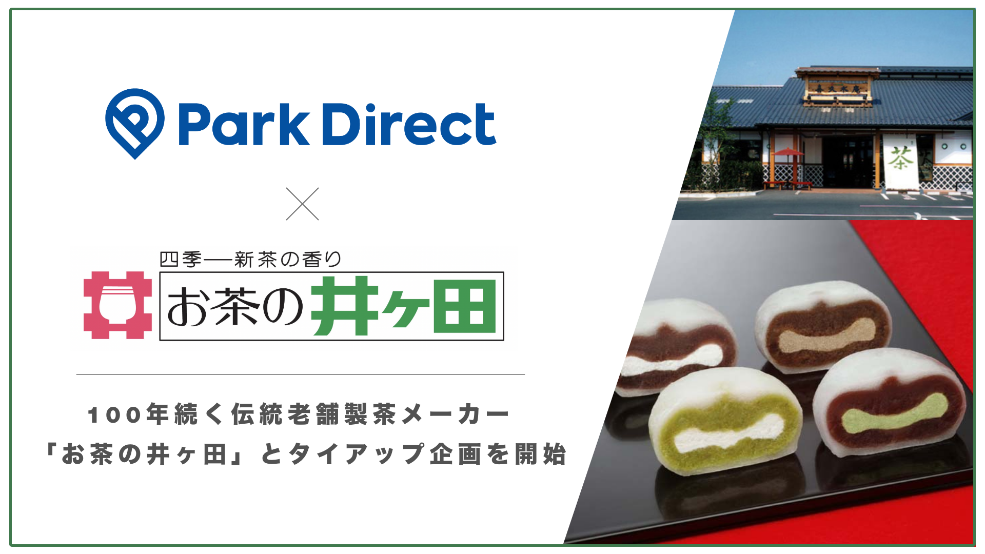 モビリティSaaS「Park Direct(パークダイレクト)」(https://www.park-direct.jp/)を運営する株式会社ニーリー(東京都中央区、代表:佐藤 養太、以下「ニーリー」)は、宮城県仙台市で大正9年創業の100年続くお茶製品の製造・販売を行うお茶の井ヶ田株式会社(宮城県仙台市、代表:井ヶ田健一、以下「お茶の井ヶ田」)と連携し、Park Directをご利用の全ての借主に向けたサービス提供の拡大を目的としたタイアップ企画を実施します。
