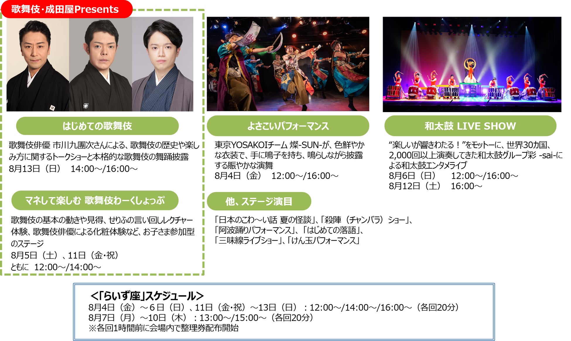 会場中央の四方を提灯で彩られたステージでは、「らいず座」と題し、日本の伝統文化を目の前でを味わえるステージコンテンツを展開します。その目玉として、歌舞伎・成田屋が登場し、子どもも楽しめるステージとして本格的な歌舞伎の舞を披露する「はじめての歌舞伎」、歌舞伎の見得やせりふの言い回し、化粧を体験するステージワークショップ「マネして楽しむ 歌舞伎わーくしょっぷ」を開催します。そのほか、怪談や殺陣、和太鼓、阿波踊りパフォーマンスなどさまざまな演目を日替わりで開催し、日本の文化が体感できます。