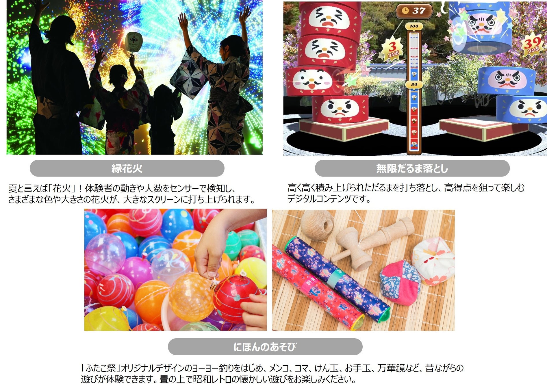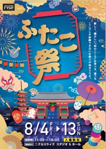 暑さが続く中、涼しい屋内で存分に楽しめる夏休みイベントとして、夏祭りをテーマに「ふたこ祭」を開催します。「ふたこ祭」は、日本の文化や遊びをモチーフとしたデジタルコンテンツや、昔ながらの遊びを体験できる「縁日小路」、伝統芸能の第一線で活躍するゲストが登場し、“ホンモノ″を味わえるステージ「らいず座」を中心に展開します。
