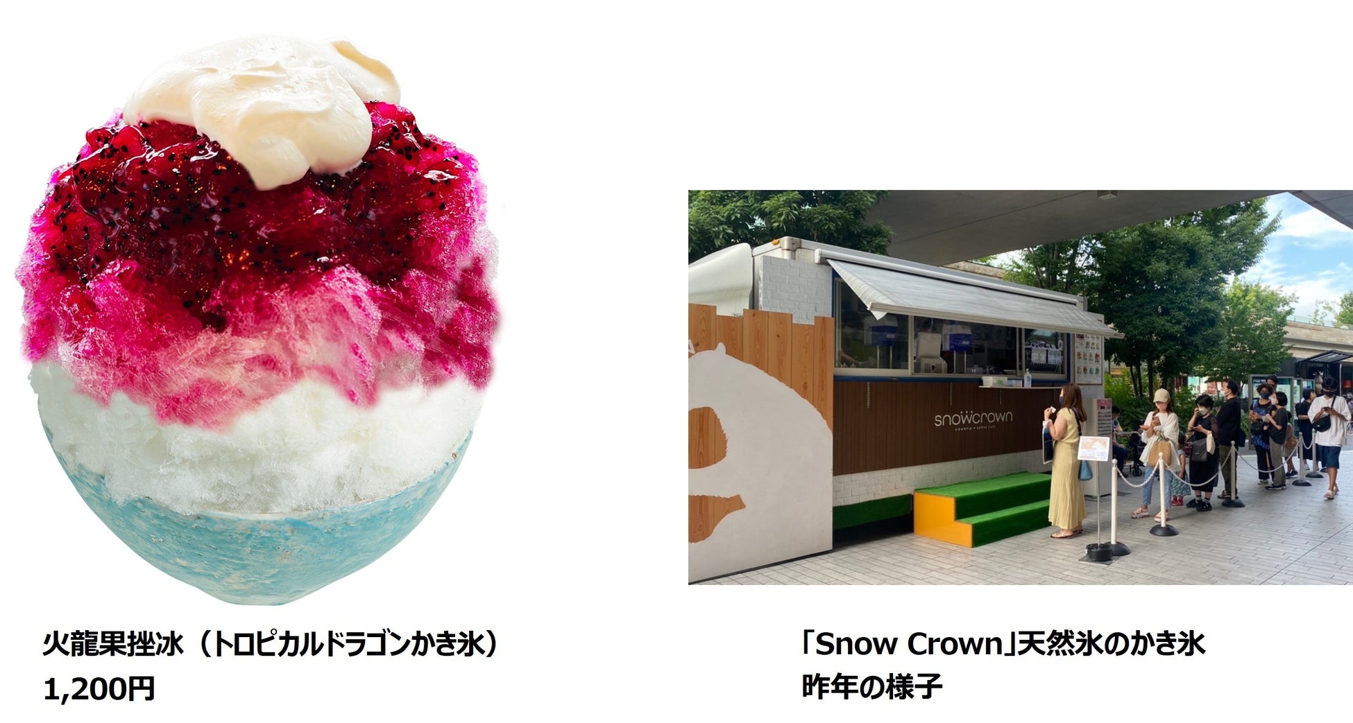 今年は、中央広場で開催中の「PREMIUM BEER TERRACE yum yum Asia(ヤムヤムアジア)」と連動した二子玉川ライズオリジナルかき氷「火龍果挫冰(トロピカルドラゴンかき氷)」が登場します。南国のフルーツ「ドラゴンフルーツ」を使用し、新たに開発した「アジアンラッシーシロップ」をたっぷりかけてご提供します。ドラゴンフルーツソースの甘みとラッシーの程よい酸味が絶妙なハーモニーを奏で、爽やかな味わいの新しいかき氷です。