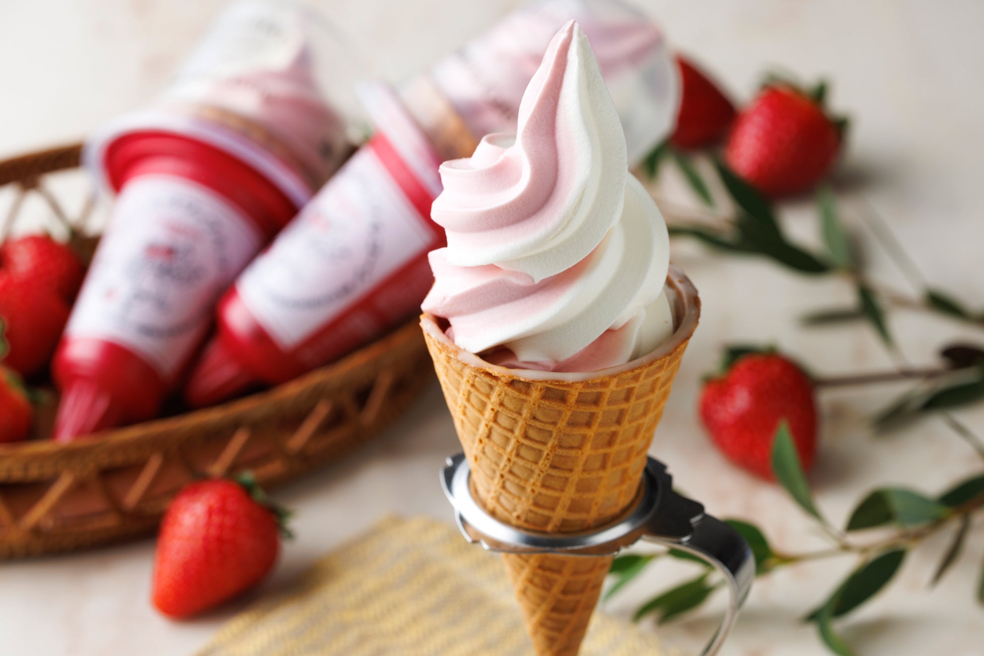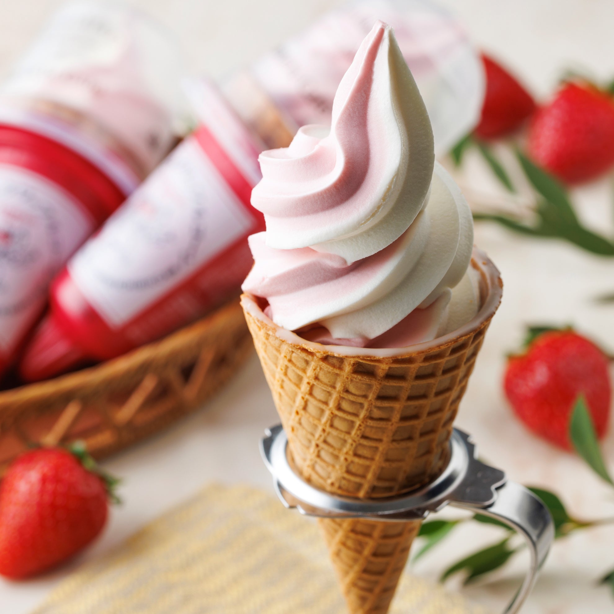 ミルクの白といちごピンクのコンビネーションがかわいい、2色アイスです。いちごの甘みと香りが楽しめる“いちごアイス”と程よい甘さに仕立てた“ミルクアイス”を組み合わせました。