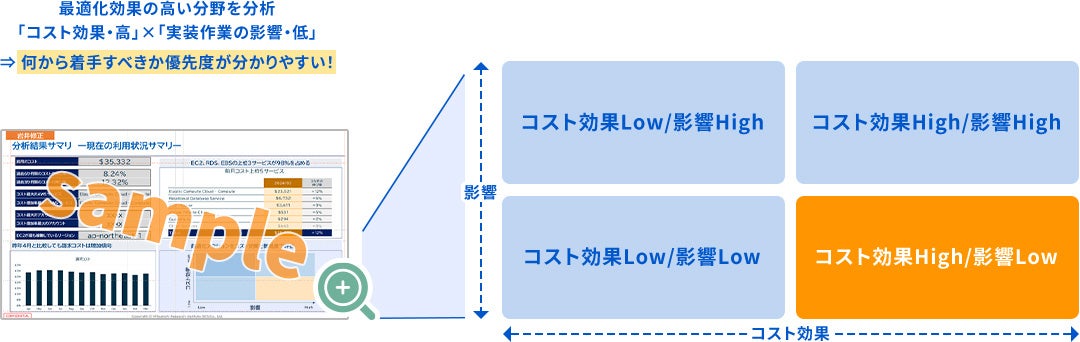 契約から最短約2ヶ月でAWS利用実態とコストの妥当性を分析し、レポート形式で明確化します。レポートはコスト効果や影響に基づき優先度が提示され、何から対応を始めるべきか分かりやすい内容になっています。