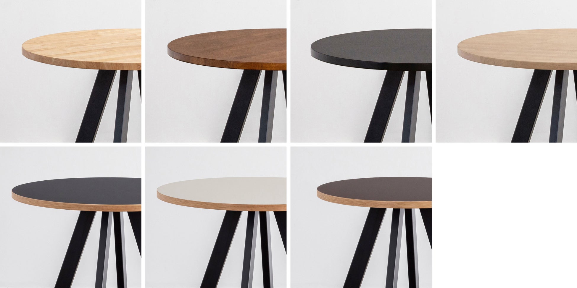 天板の直径は1cmごとの無料サイズオーダーが可能です。素材はラバーウッド4色とリノリウム3色、テーブル脚は1種類、チェアの組み合わせは1種類のパターンをご用意しています。