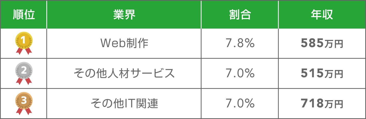 フリーランスデザイナーの案件数は、業界による偏りは少なく、業界別平均年収では、その他IT関連業界が718万円と高い結果となりました。