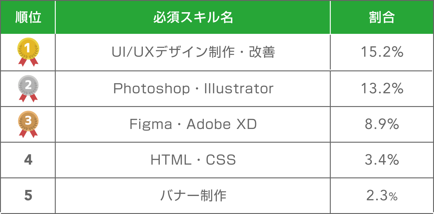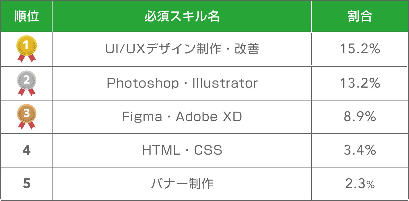SOKUDAN(https://sokudan.work/)に掲載されたデザイナー案件で、フリーランスデザイナーに求められる必須スキル項目に入力されたスキル名から上位5つを記載しております。