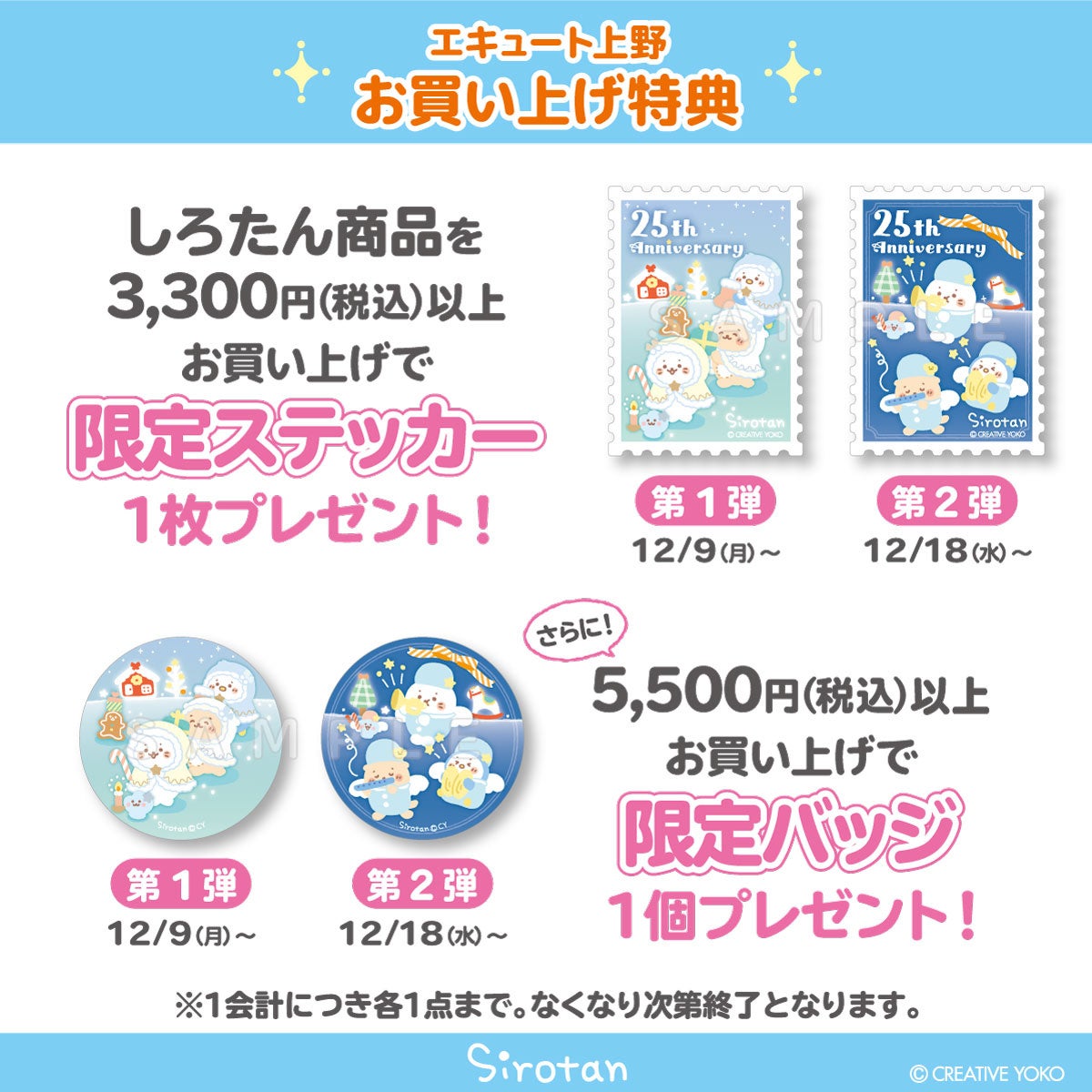株式会社クリエイティブヨーコ(本社:長野県長野市 代表取締役社長:北原 武幸)は、“たてごとアザラシ“をモデルとしたオリジナルキャラクター『しろたん』のポップアップストア「しろたんふんわりストア」を、12月9日(月)~12月25日(水)の期間、JR東日本上野駅のエキナカ商業施設「エキュート上野」にオープンします。