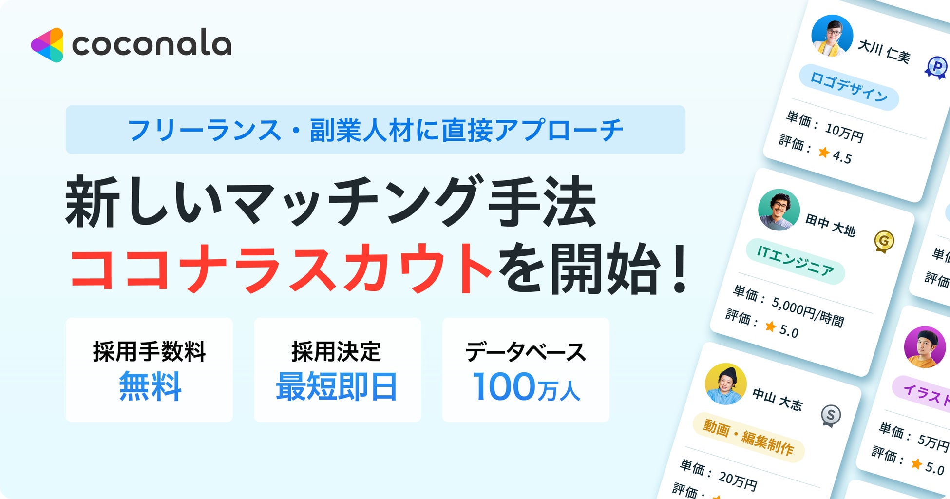 日本最大※のスキルマーケット「ココナラ」をはじめ、「ココナラ法律相談」「ココナラ募集」、4つのエージェントサービスを運営する株式会社ココナラ(本社:東京都渋谷区、代表取締役社長CEO:鈴木 歩、以下「当社」)は、4月21日(月)より企業の外部人材の活用における採用方法の拡充を目的に、ココナラに登録している100万人のプロ人材に直接アプローチができる新たなマッチング手法「ココナラスカウト」を開始します。