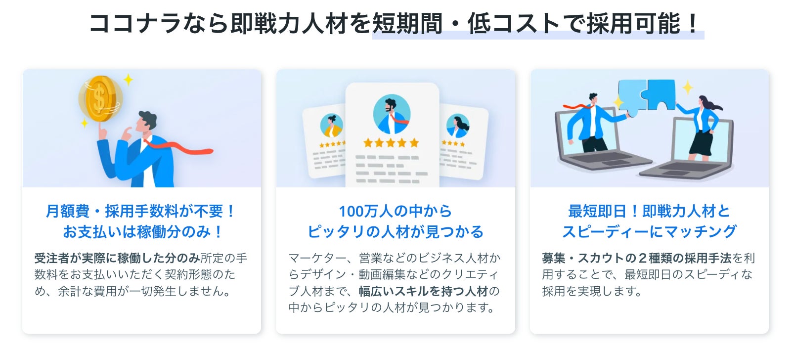 また、応募を募る「ココナラ募集」と能動的にアプローチできる「ココナラスカウト」を併用して活動することで、よりスピーディーに即戦力人材と出会うことができるようになります。