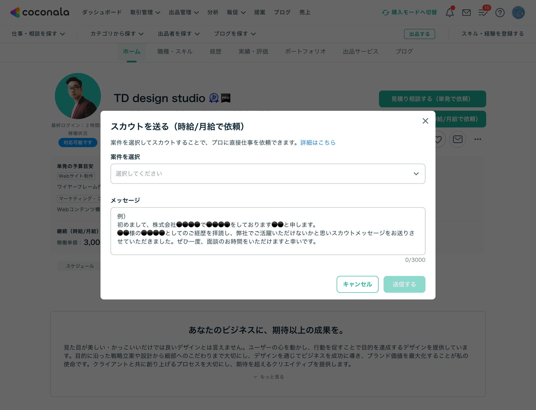 依頼したい候補者のプロフィール画面から、依頼したい案件の内容や自社のアピールポイントを記載してスカウトを送信します。