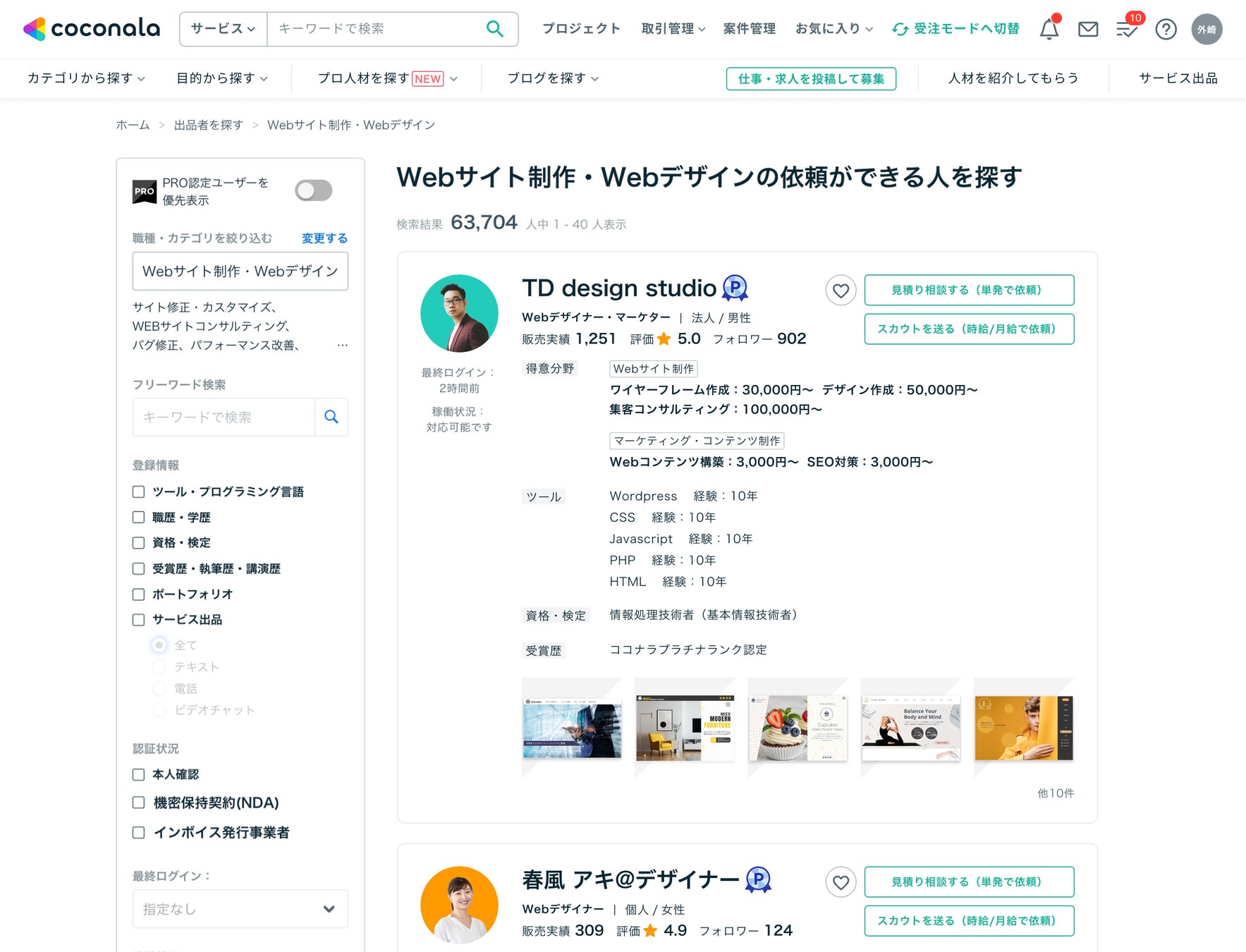ココナラに会員登録後、トップページの「プロ人材を探す」からカテゴリを選択して検索。スキルやポートフォリオ、取引評価などを見ながら候補者を絞り込みます。