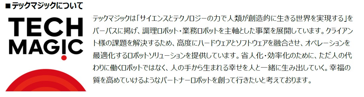 テックマジックは、2018年2月に設立。「サイエンスとテクノロジーの力で人類が創造的に生きる世界を実現する」をパーパスに掲げ、食を取り巻く多くの企業が直面する人手不足を解消し、人がより付加価値の高い業務に従事し、生産性の高い社会を実現するために、最新のAIやロボット技術を高度に融合した各種プロダクトの企画、設計、販売、保守を行っています。