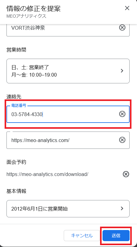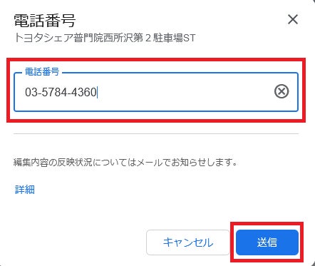 3.情報の修正を提案の連絡先の電話番号を正しい番号に変更し送信