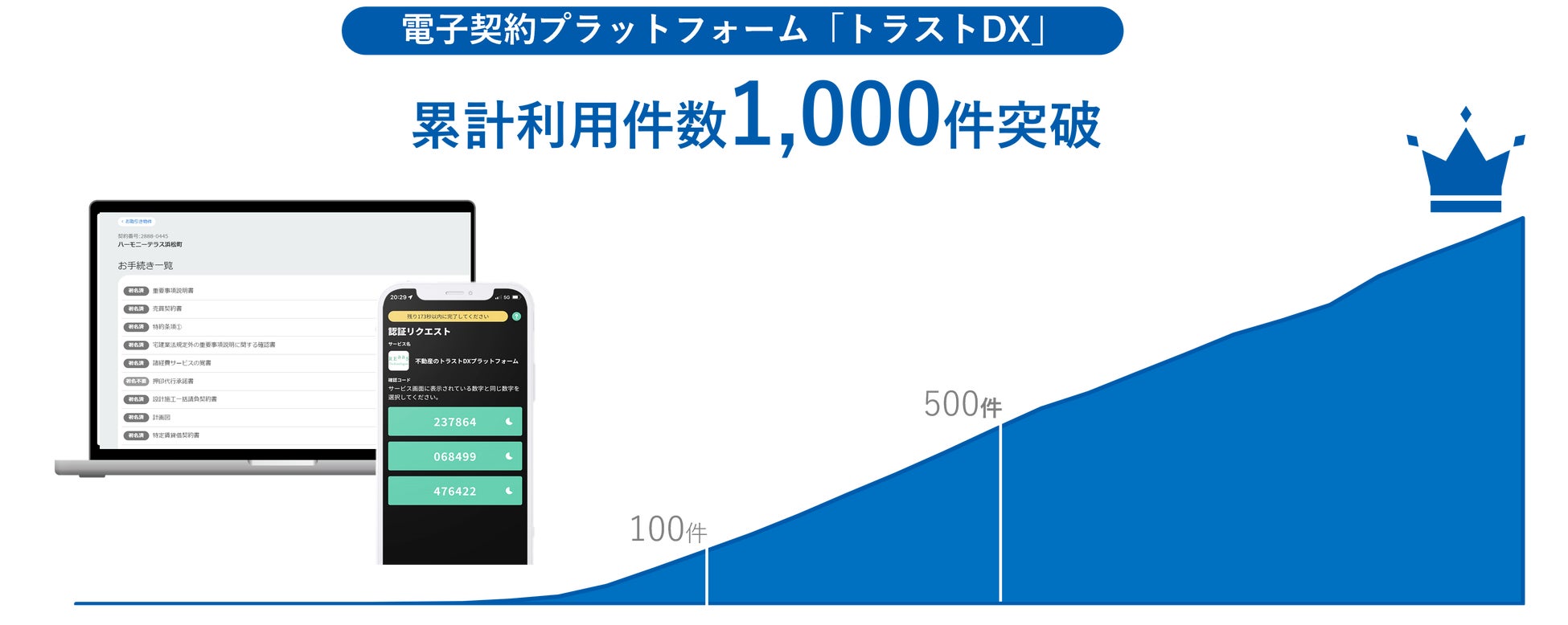 宅地建物取引業の改正に向けて2021年7月に試験運用を開始したトラストDXは、業界初となるマイナンバーカードと連携した「本人確認」と、多要素認証による「意思確認」を同時に行うことで「なりすまし」や「改ざん」を防止する安全な不動産売買契約を実現し、この度、累計利用件数が1,000件*1を突破しました。