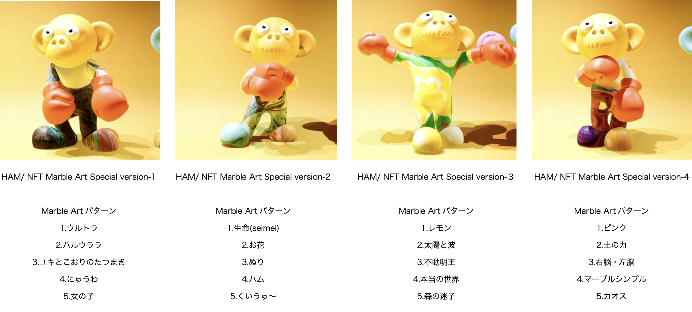 COVID-19のパンデミックを機に、グッドラックを祈る対象のマスコットとして制作され、生まれたHAM(ハム)に、子どもたちのNFT Marble Art作品をのせたSpecial versionのHAM(ハム)たち。