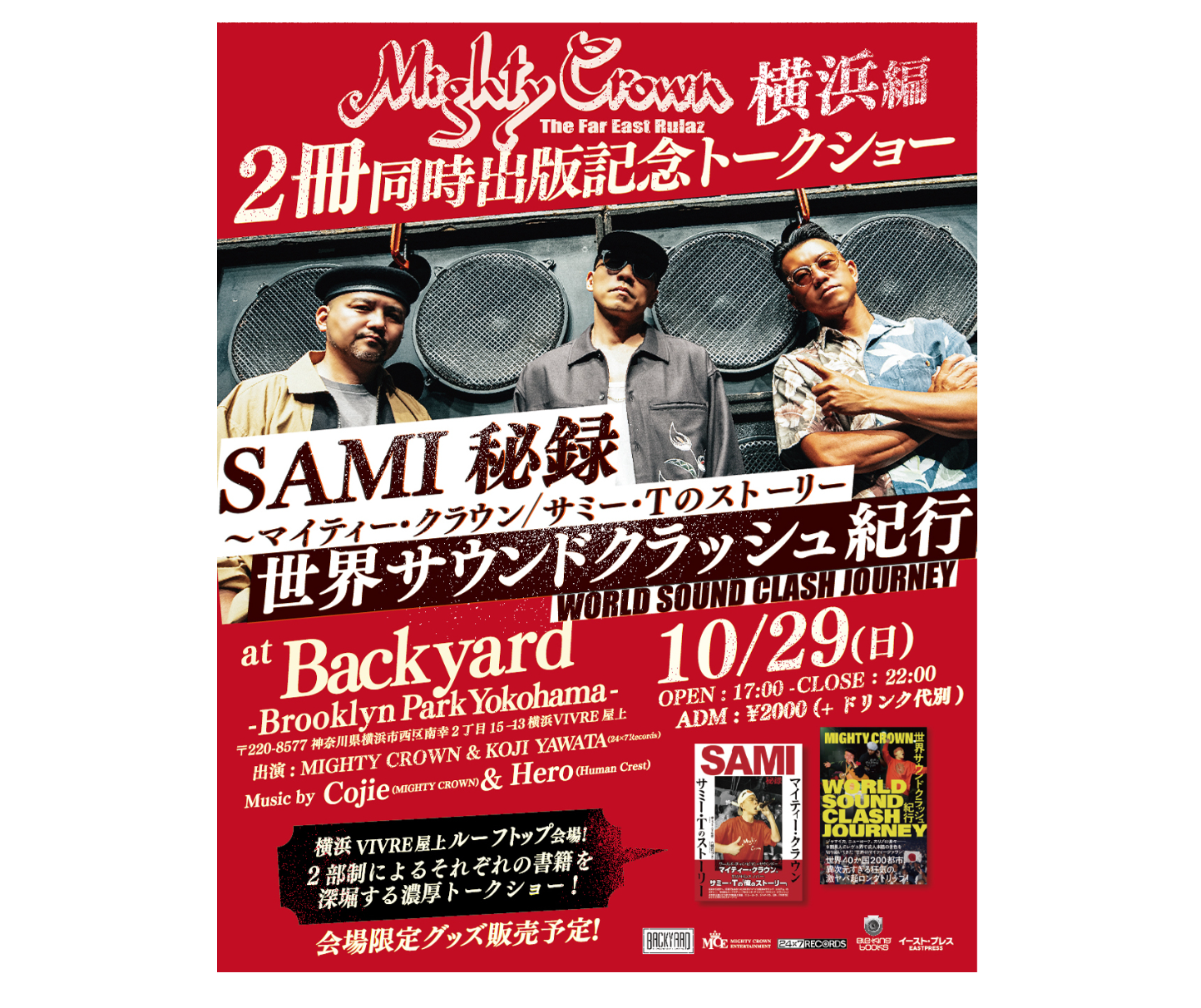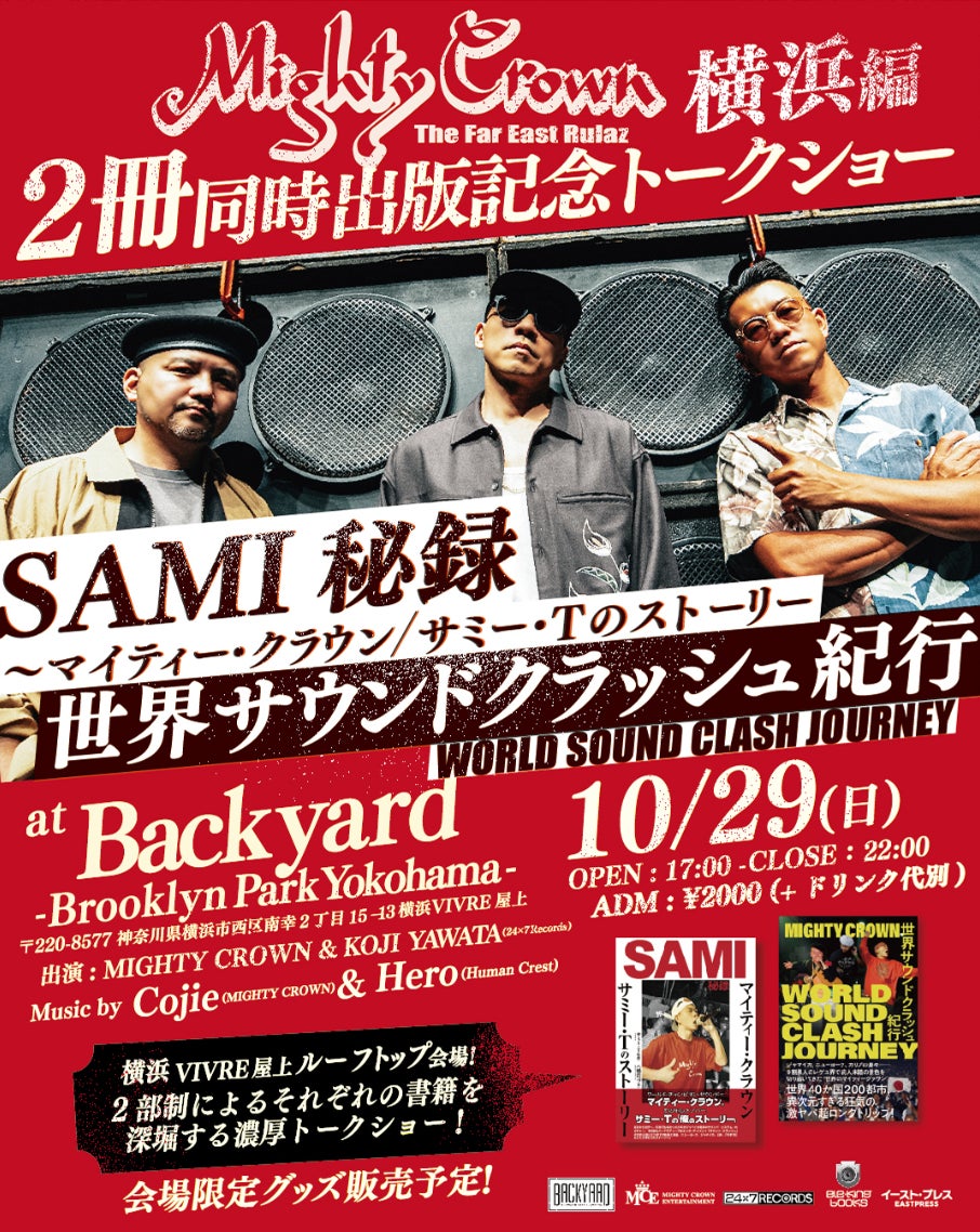 この度は10月29日(日)に、日本代表のみならず世界のレゲエアンバサダーやカルチャーアイコンとして活躍するレゲエサウンドグループ・Mighty Crownの出版記念トークショーを開催する運びとなりました。本トークショーはMighty Crownを紐解くヒストリー本、「SAMI秘録~マイティー・クラウン/サミー・Tのストーリー」、「世界サウンドクラッシュ紀行」の2冊同時出版記念としての実施となります。ぜひ会場へお越しください。