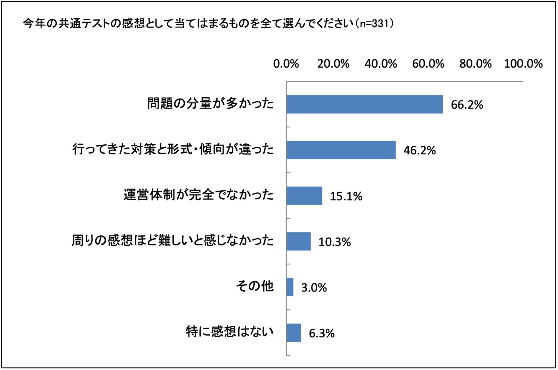 今年の共通テストに関して、66.2%が「分量が多かった」、46.2%が「行ってきた対策と形式・傾向が違った」と回答