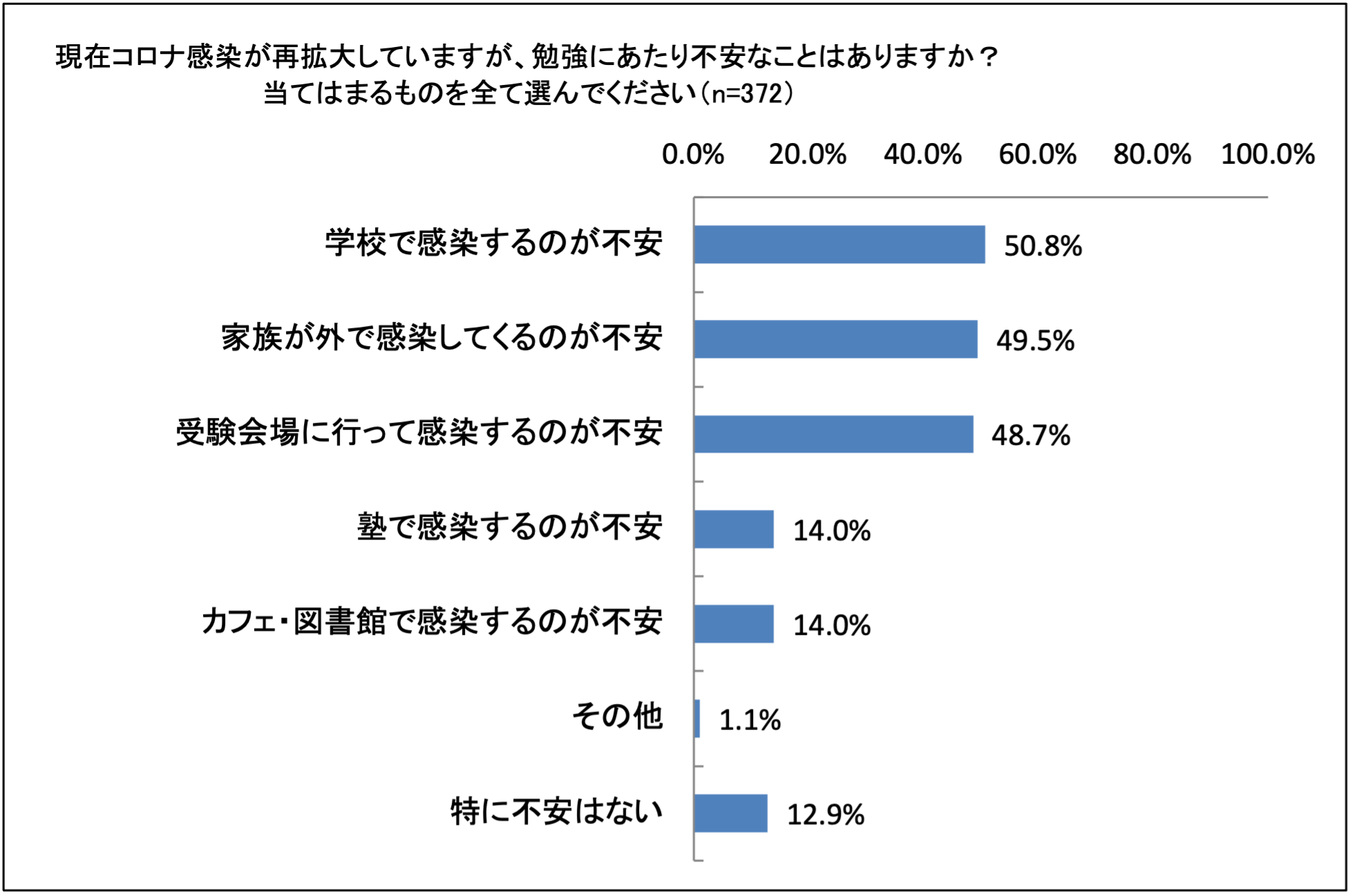 ・現在、新型コロナウイルスの感染が再拡大する中で87.1%の受験生が何らかの不安。学校、家庭内、受験会場での感染を不安視する受験生がそれぞれ約半数