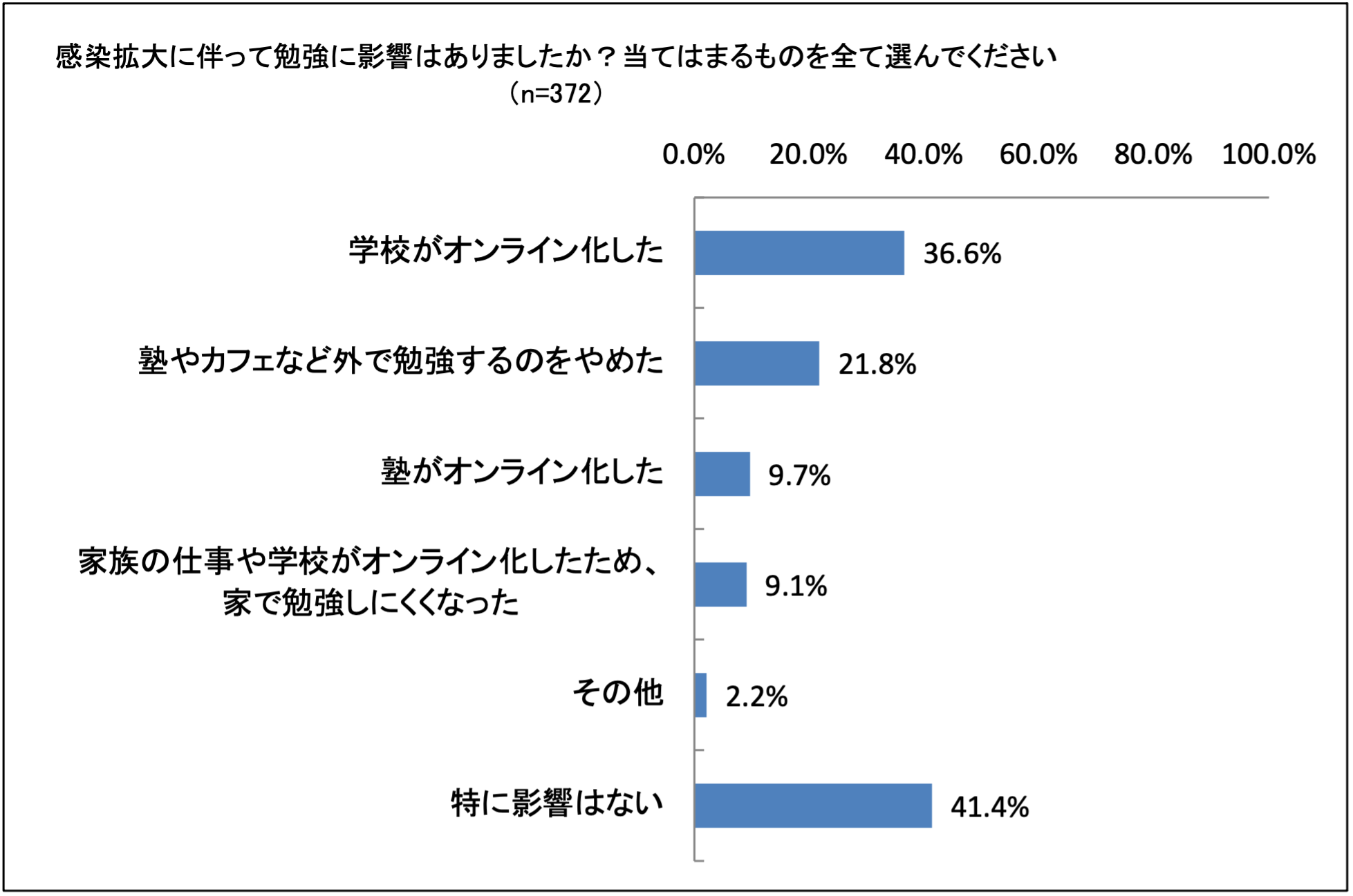 新型コロナウイルスの感染が再拡大する中、36.6%が学校のオンライン化、9.7%が塾のオンライン化が起こったと回答