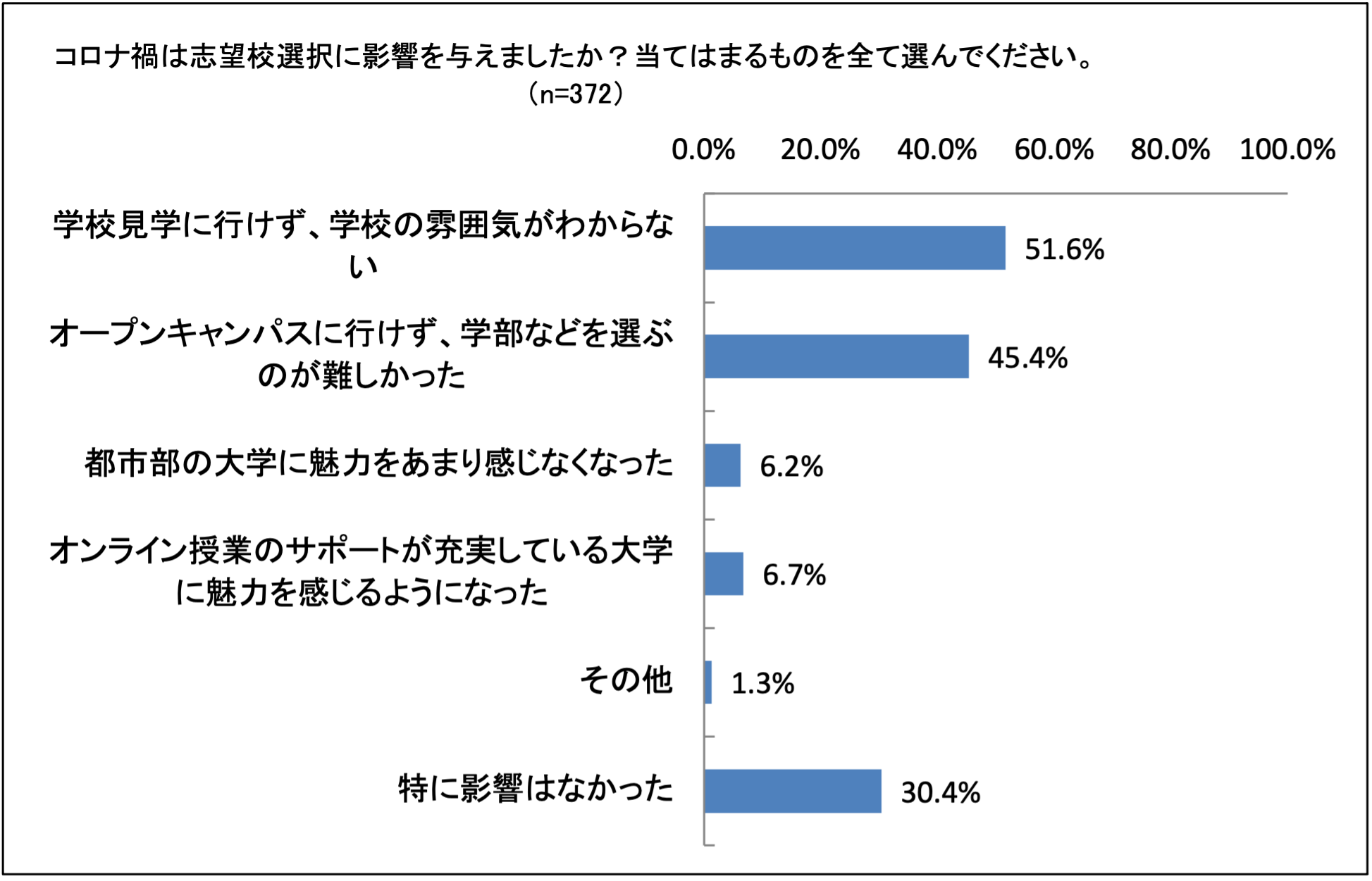 また、新型コロナが志望校に及ぼした影響として、半数以上が「学校見学ができなかったことで大学の雰囲気が掴めなかった」をあげました。他にも、地方との距離を考えて都会での受験を控えた、などの意見がありました。