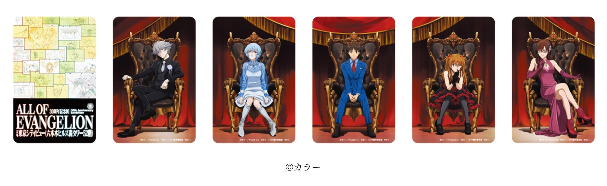 東京会場では、平日限定で特製「ALL OF EVANGELIONオリジナルカード」をプレゼントします。本展のために描き下ろした登場人物が特別にデザインされた、5種類のオリジナルカードのビジュアルを公開!5種類を並び合わせると1つのデザインが完成します。